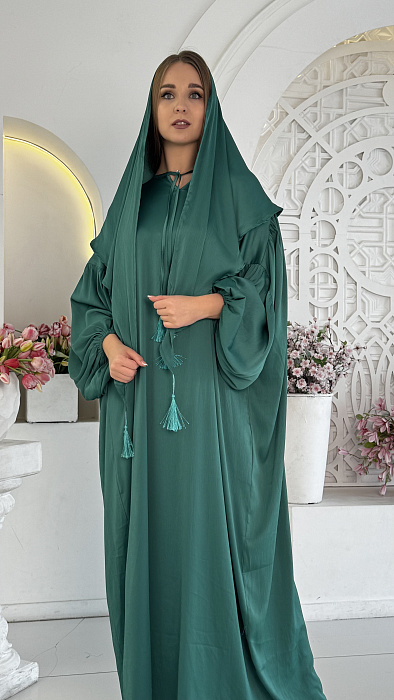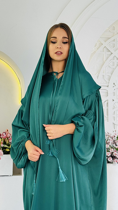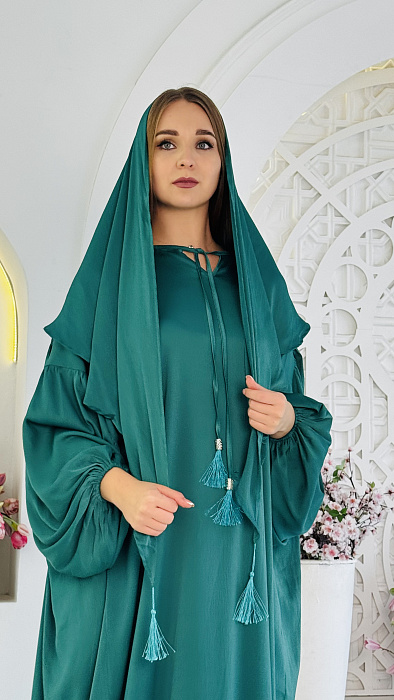 Палантин: К абайе прилагается соответствующий по цвету палантин из дубайского шелка, который можно использовать как хиджаб или накидку, завершая образ.