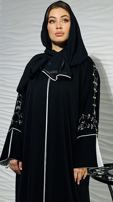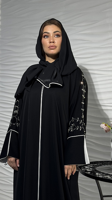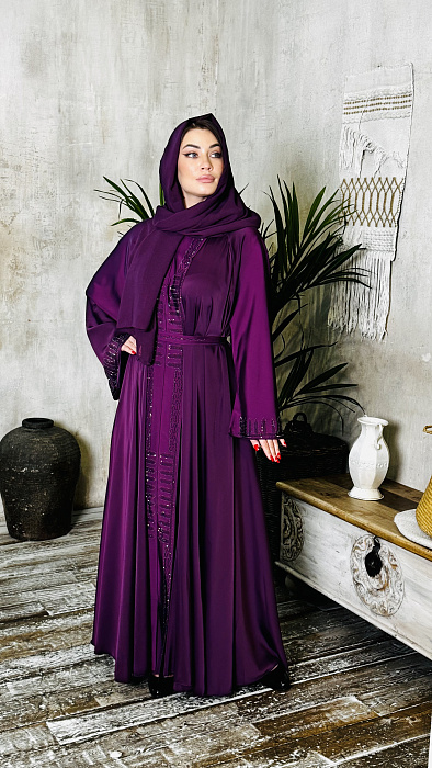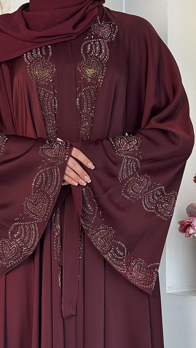 Изысканный декор из сверкающих страз придает абайе неповторимый шарм и великолепие. Каждая страза аккуратно закреплена, создавая мерцающий узор, который приковывает взгляды и подчеркивает ваш безупречный вкус. Это идеальный выбор для особых случаев и торжественных мероприятий.