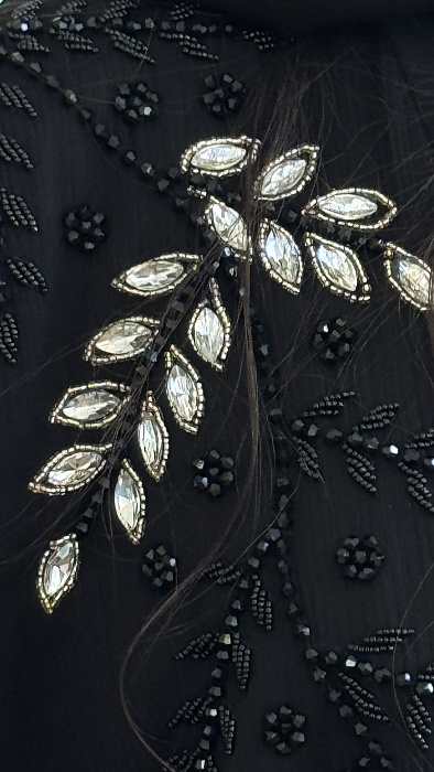 Роскошная вышивка, выполненная в традиционных восточных мотивах, словно оживает на ткани, создавая неповторимый узор. Блеск страз, рассыпанных по платью, напоминает мерцание звезд на ночном небе, добавляя образу шик и изысканность. Каждый элемент декора тщательно продуман и выполнен с безупречным мастерством, что придает платью особую ценность.