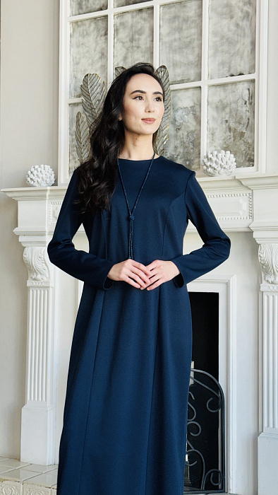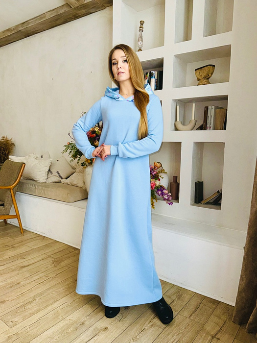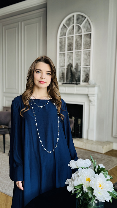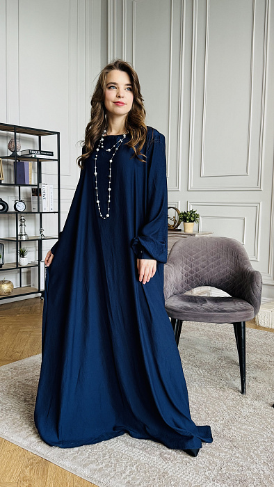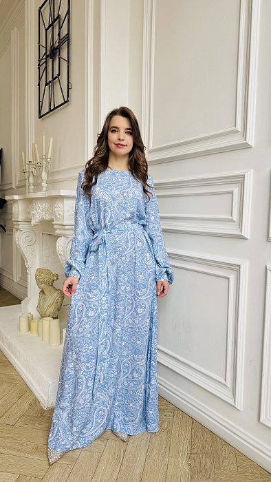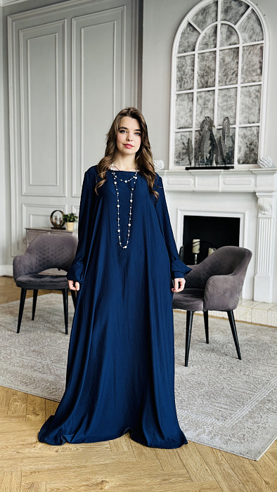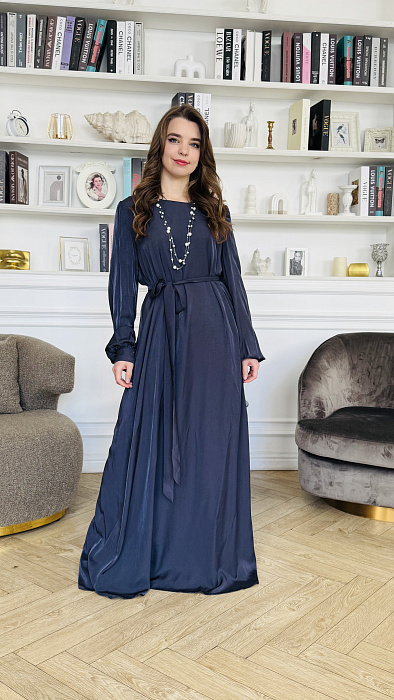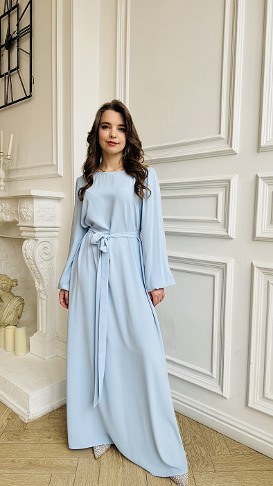 А-силуэт, нестареющая классика, деликатно подчеркивает достоинства фигуры, мягко скрывая нюансы и акцентируя плавность линий. Платье нежно обнимает плечи, спускаясь волной ниспадающей ткани. Длина макси добавляет образу королевского величия, делая его уместным и на залитой солнцем террасе, и на вечернем приеме под мерцающими звездами. Цвет – небесная лазурь, застывшая в шелке.