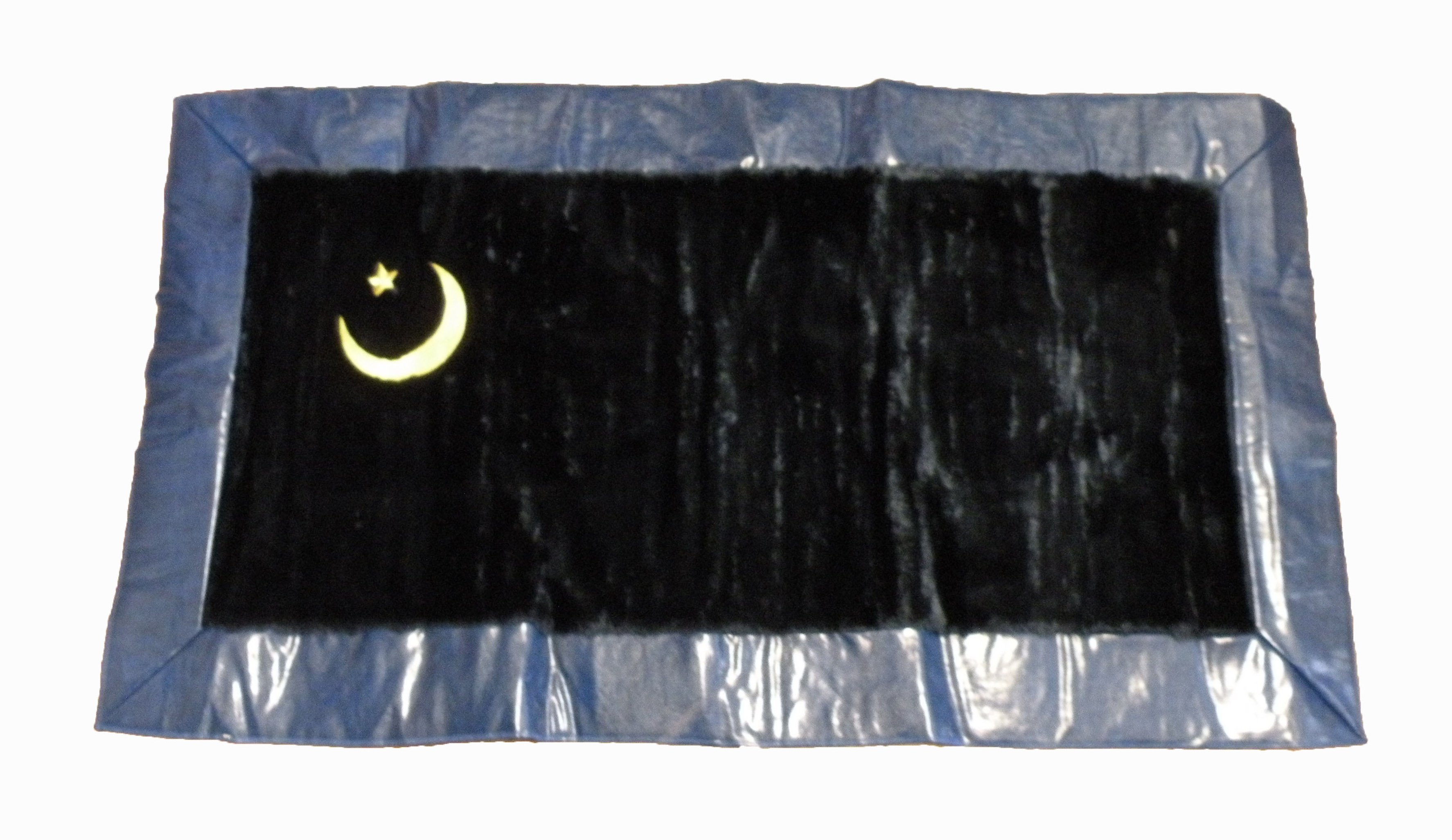 Эксклюзивный коврик для намаза выполнен из искусственного меха, посередине темно-синий цвет, по краям синего цвета эко кожа. Размер 124х67 см. Производство Турция.
