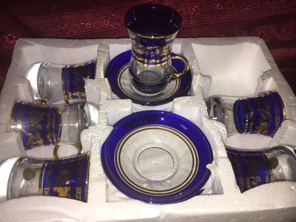 Набор для чая на шесть персон. Стеклянные чашки выполнены в турецком стиле, с блюдцами. Расписаны красивым восточным рисунком. Производство Турция.