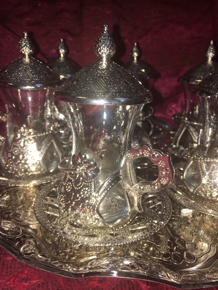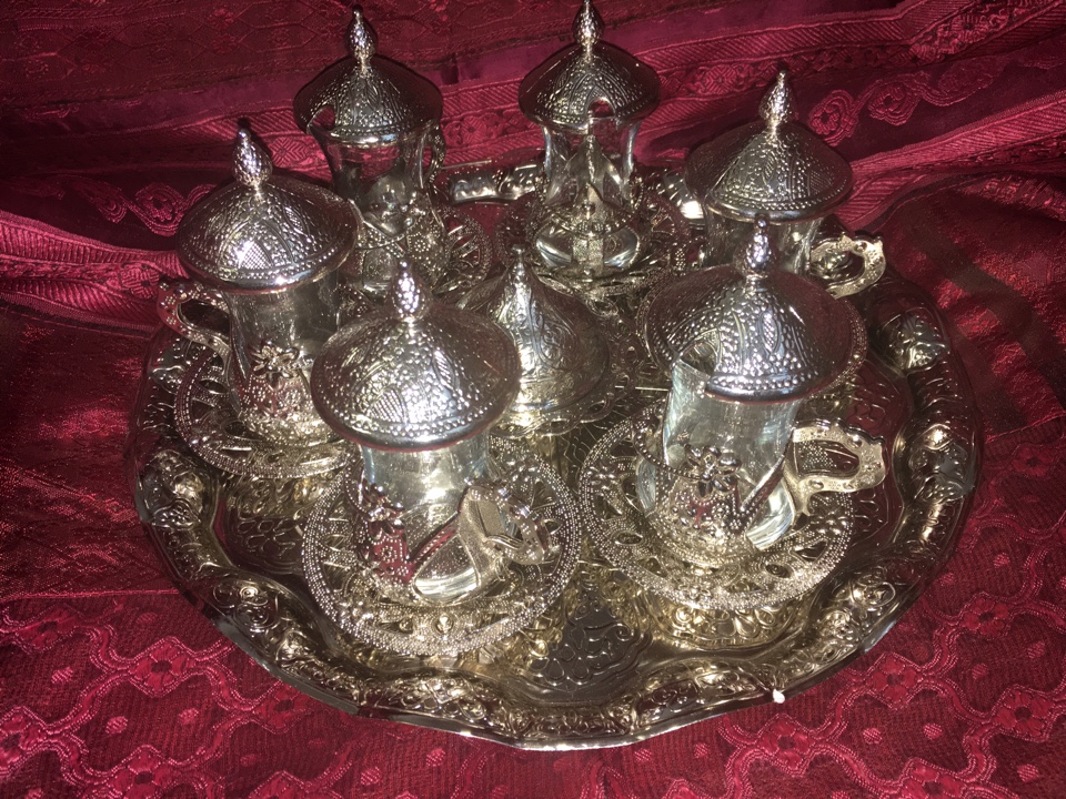 Кофейный набор на шесть персон, прилагается поднос и тарелочка с крышкой для лукума или сладостей. Набор выполнен из металла и керамики. Настоящая кофейная церемония должна была пройти с восточным колоритом. Производство Турция.