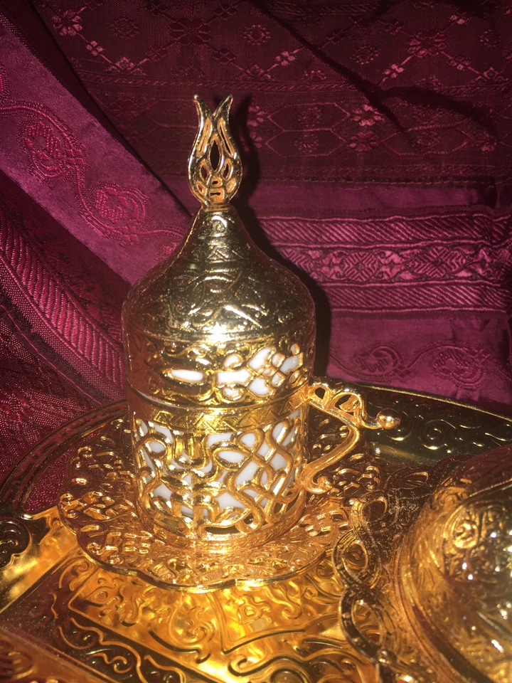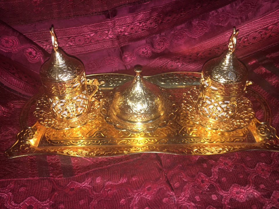 Кофейный набор на две персоны, прилагается поднос и тарелочка с крышкой для лукума или сладостей. Набор выполнен из металла и керамики. Настоящая кофейная церемония должна была пройти с восточным колоритом. Производство Турция.
