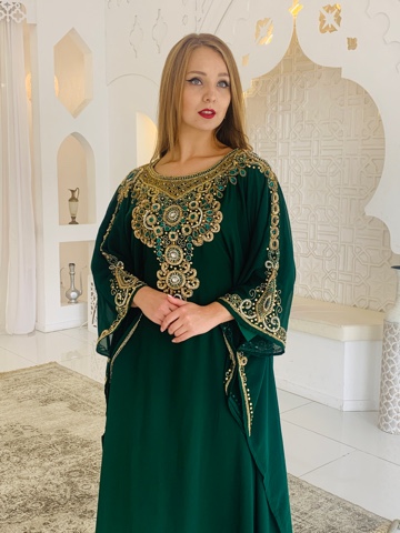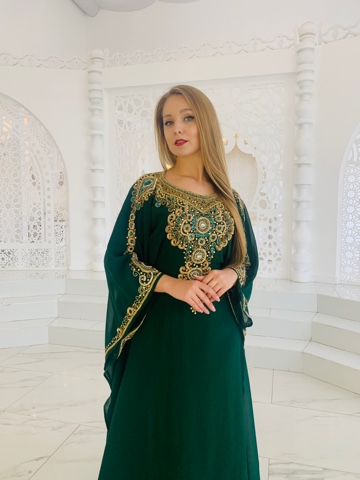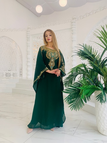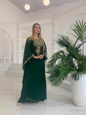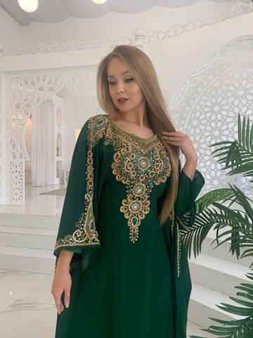 Шикарная абая с роскошной вышивкой. . Верхняя абая оверсайз покроя летучая мышь, прилагается нижнее платье. Внутри на талии кулиски ,придают приталенность в зоне талии. Размер от 44 до 52. Производство ОАЭ