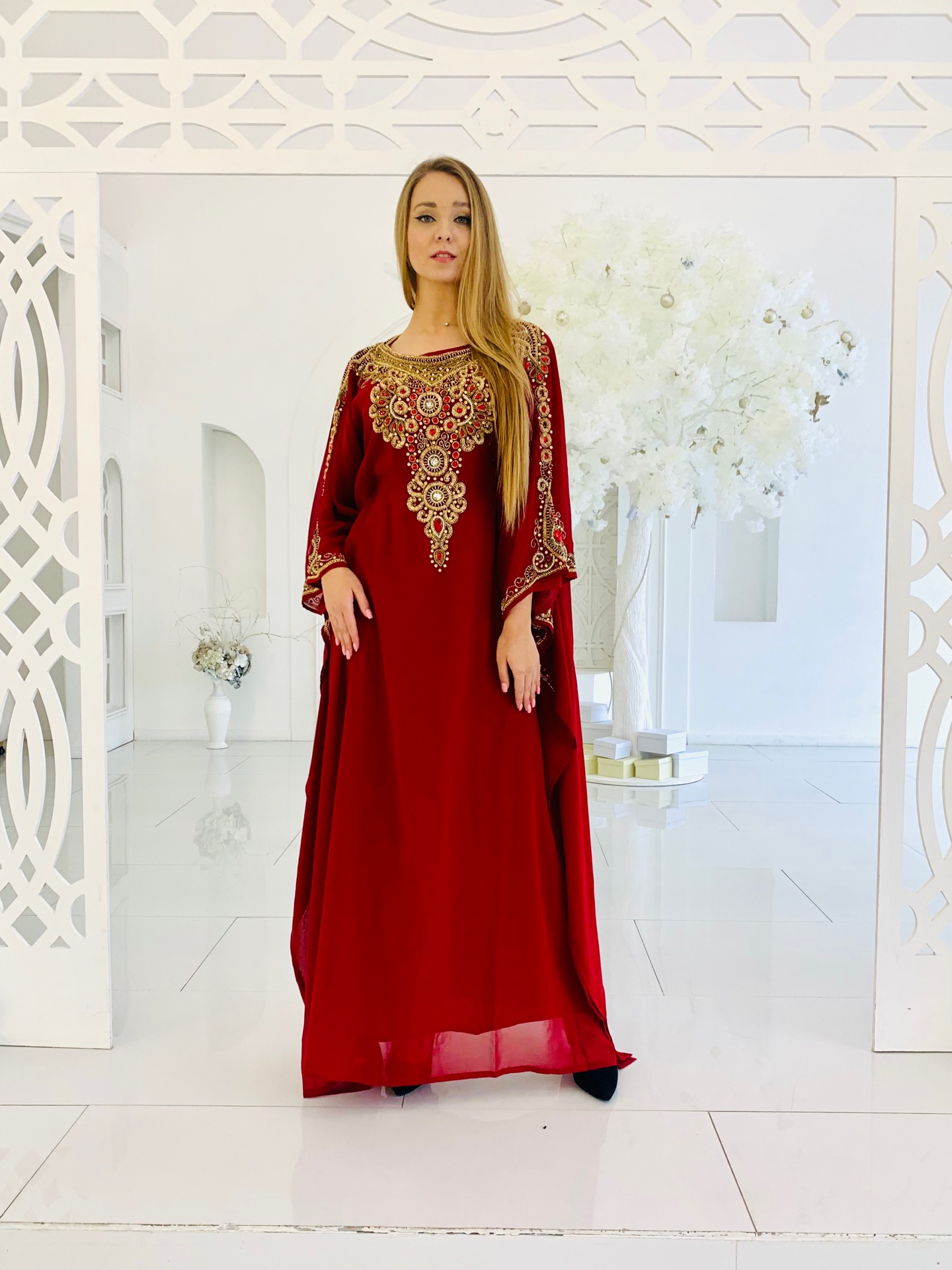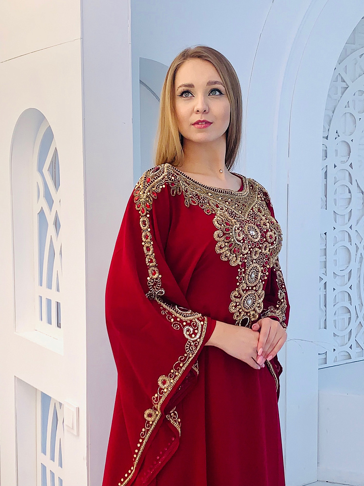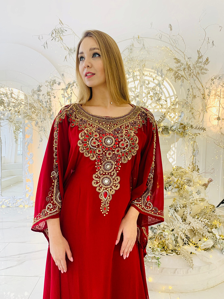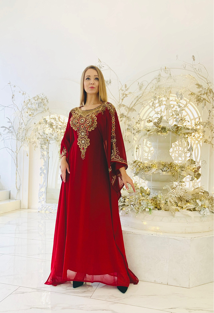 Роскошная абая бордового цвета с шикарной вышивкой и декором из камней. Царская вышивка ручной работы. Размер единый от 44 до 54. Ткань - шифон.
