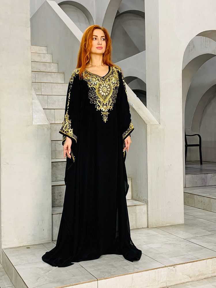 Шикарная абая с богатой вышивкой и декором из камней . Размер единый от 44 до 54. Ткань шифон. Состоит из нижнего и верхнего платья с вышивкой ручной работы. Внутри кулиски в зоне талии. Длина до 150см. Производство ОАЭ
