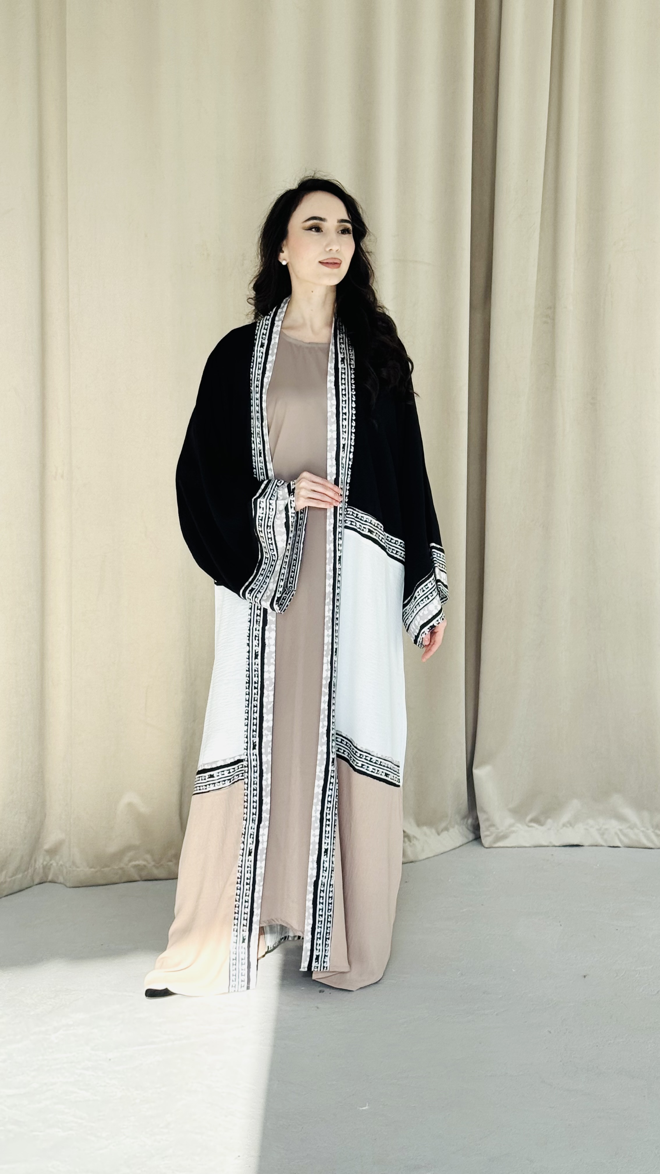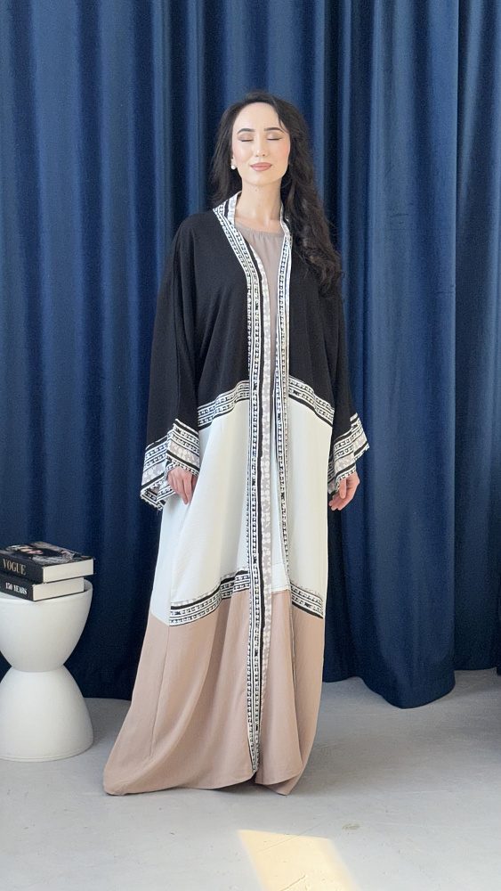 Мусульманская абая изысканного кроя с широкими рукавами и красивым принтом. Модель овесрайз подойдет на размер от 46 до 52. Длина макси