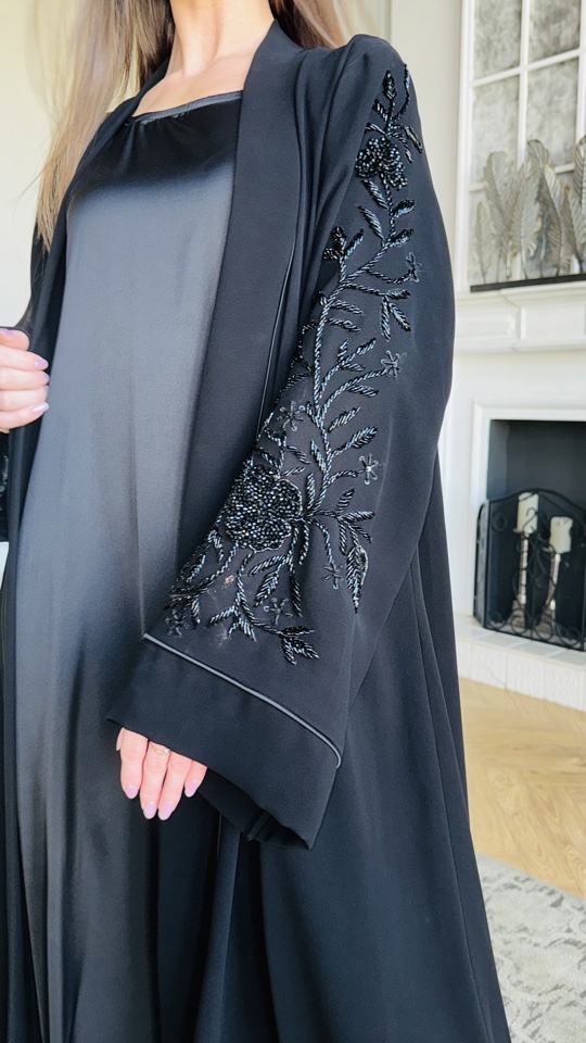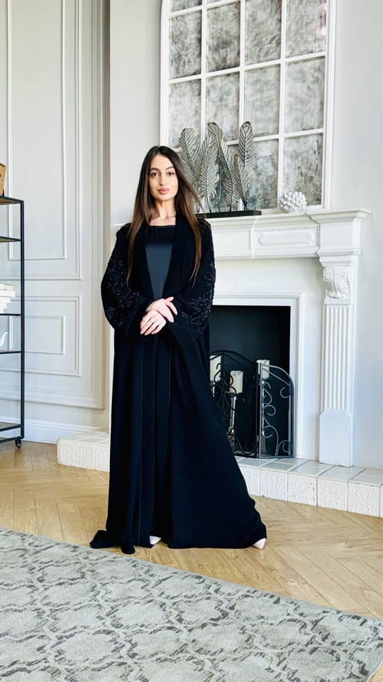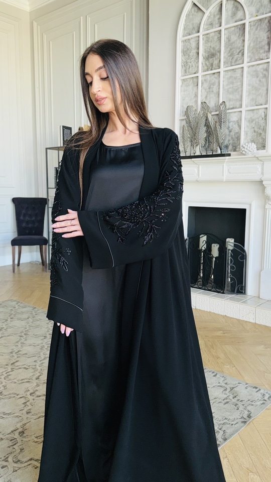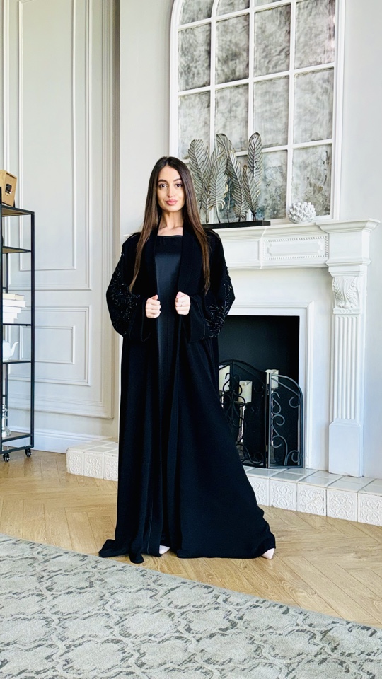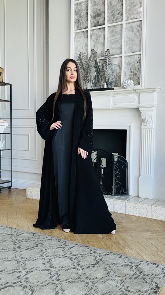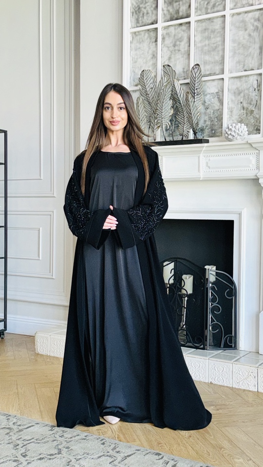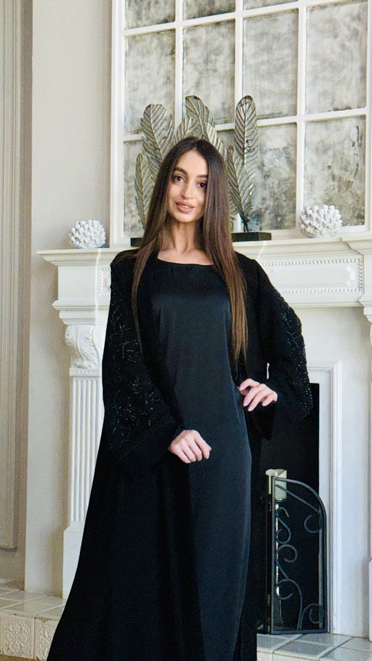 Абая люкс с вышивкой на рукавах , производство Катар . Размер 46-54. Длина макси. Ткань - катарский шелк . Рост модели 165 см.