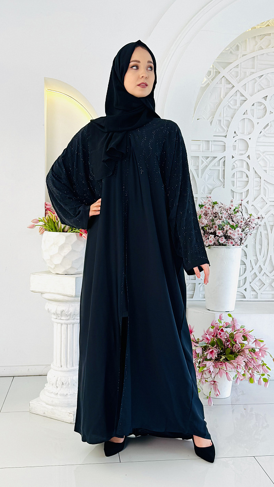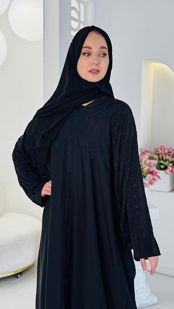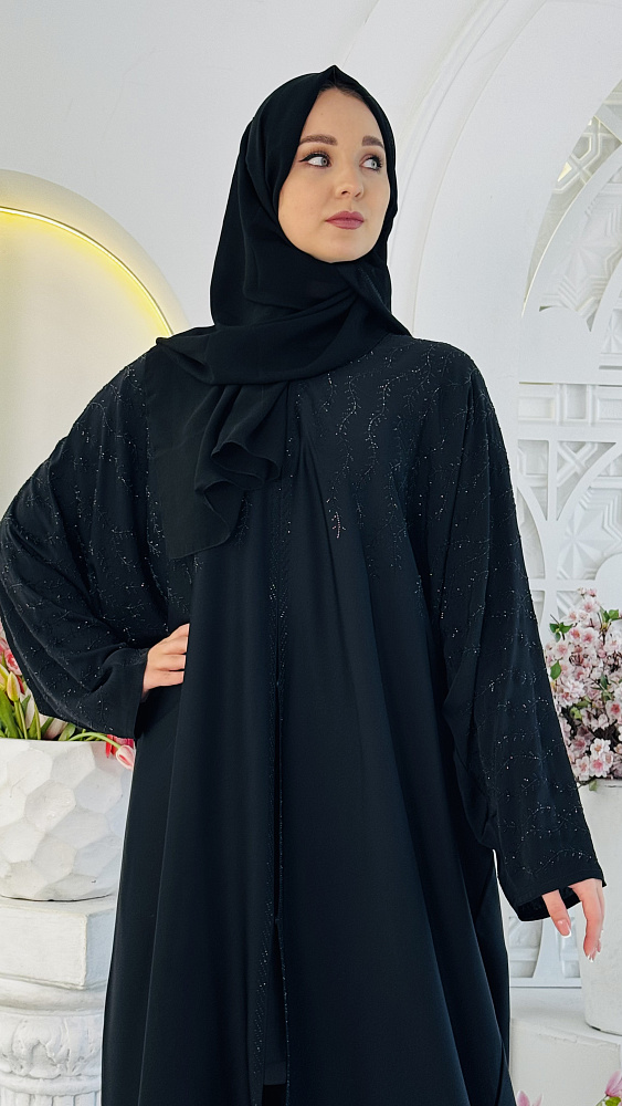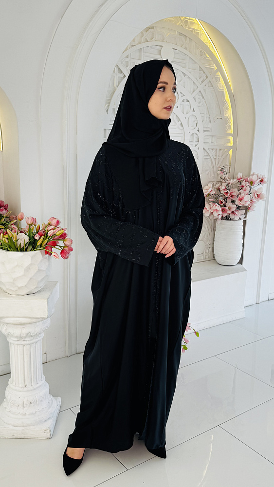 Современные женщины видят в абайе не только дань традициям, но и средство выразить свою неповторимость. Умело сочетая её с туфлями на каблуках, дизайнерскими сумками, изысканными украшениями, они создают уникальные и запоминающиеся образы. Абая стала знаком уверенности, независимости и уважения к своим корням. Абая – это нить, связующая поколения, символ культурного наследия. Она напоминает о важности сохранения традиций, уважения к истории и гордости за свою идентичность. Дизайнеры и художники черпают в абайе вдохновение, создавая проекты, популяризирующие эту одежду и рассказывающие миру о её красоте и значимости. Эксклюзивная абая с красивым декором из черных страз. Модель оверсайз от 46 до 54. Длина макси на рост до 175см.