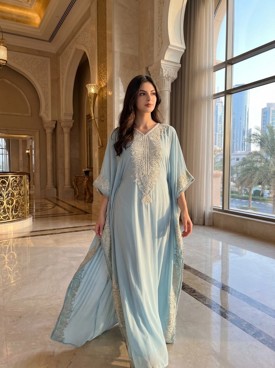 Особое внимание заслуживает роскошная вышивка, украшающая V-образный вырез и края рукавов. Белоснежные узоры, выполненные тонкой нитью и мелким нитью, изящно обрамляют вырез, перетекая на плечи и спускаясь по рукавам. Эта деликатная отделка придает абае нотку королевской роскоши, не перегружая образ. Узоры напоминают замысловатые восточные орнаменты, добавляя аутентичности и глубины дизайну. Нижний край абайи также украшен богато вышитой каймой, которая подчеркивает плавные линии подола. При ходьбе абайя слегка развевается, открывая вид на искусно выполненную отделку, создавая завораживающий эффект. Эта деталь добавляет образу динамики и элегантности, делая его поистине незабываемым. Абая выглядит так, будто соткана из солнечного света и облаков, воплощая собой идеал женственности и благородства. Эта абая - это не просто предмет одежды, это заявление о стиле, изысканности и внутренней красоте. Она идеально подойдет для тех, кто ценит высокое качество, внимание к деталям и стремится к созданию образов, которые оставляют неизгладимое впечатление. Сочетание классического кроя, нежного цвета и изысканной вышивки делает эту абайю жемчужиной любого гардероба.