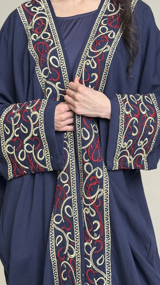Красивая мусульманская абая кардиган из ткани лён с вискозой , размер оверсайз. Модели длины макси на рост от 160 до 170см. На абае выполнена красивая ориентальная вышивка, что придает изыска модели. Размер оверсайз подойдет от 46 до 54 размера