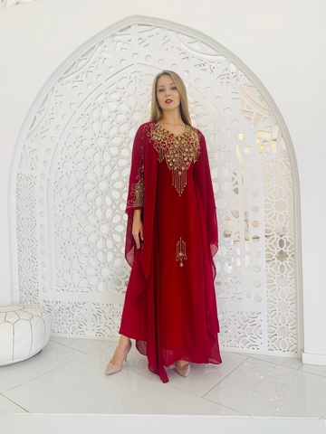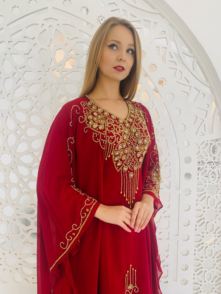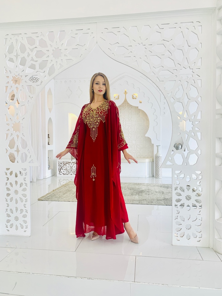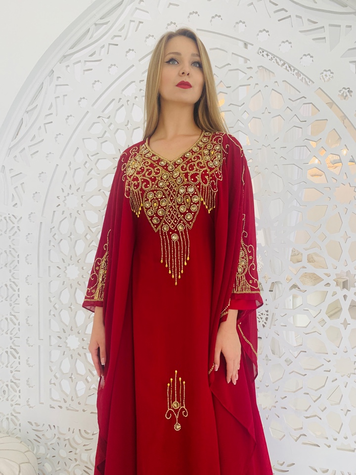 Красивое и элегантное платье красного цвета с вышивкой из камней.. Размер оверсайз. от 44 до 54. Ткань - шифон. Нижнее платье отдельно внутри, не пришито . Вернхнее платье покроя летучая мышь, длинный рукав, в районе талии кулиски для приталенности модели. Производство ОАЭ