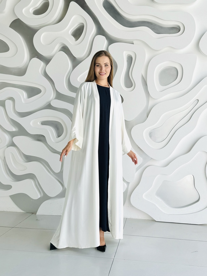 Абая накидка Мира ,изготовлена из Шелка Армани люкс молочно-белого цвета , размер 46-52. Длина на рост до 165м.Производсто Россия.