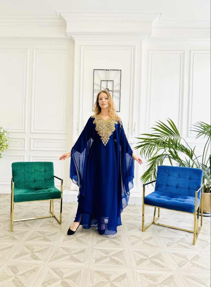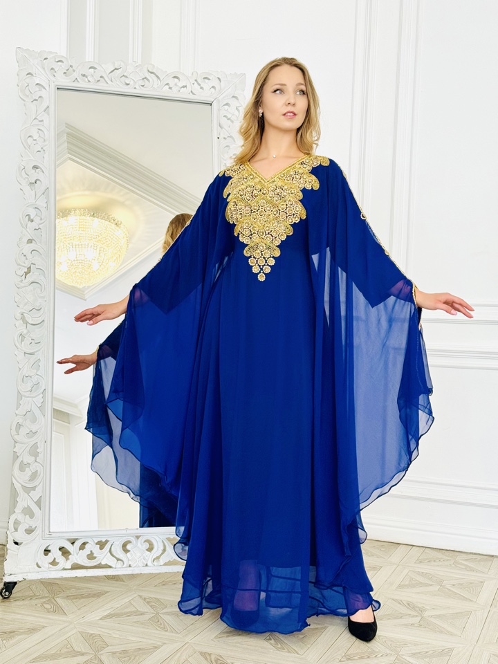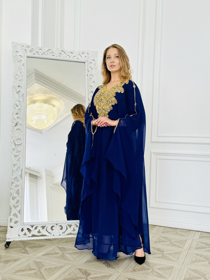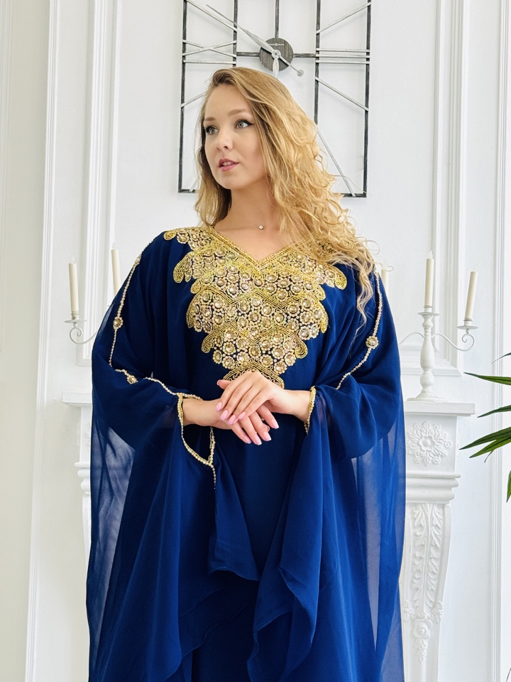 Роскошная Мароканская Абая сапфирового цвета с блестящими камнями и стразами, размер единый от 44-54. Мусульманское платье для праздничных мероприятий.