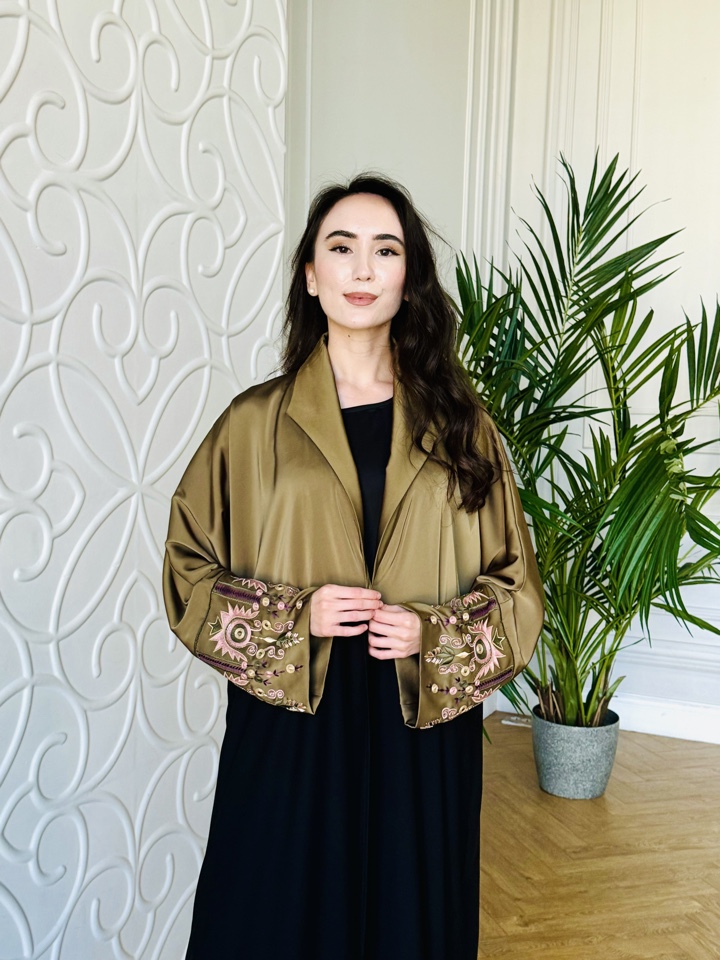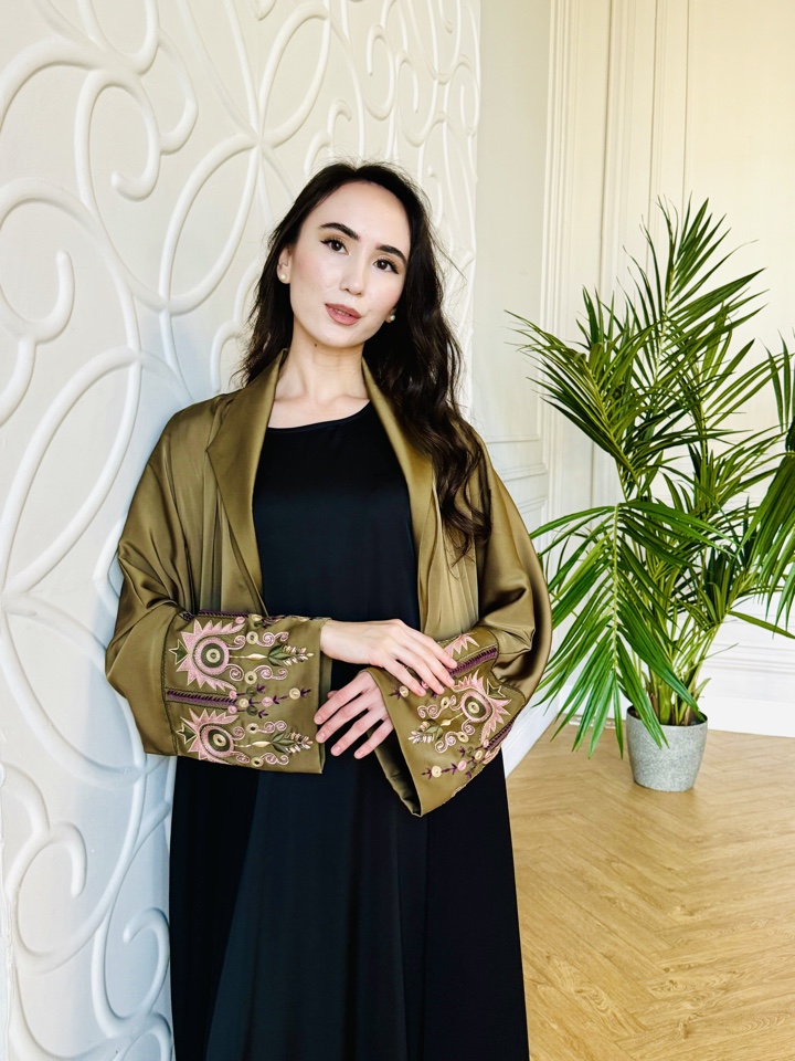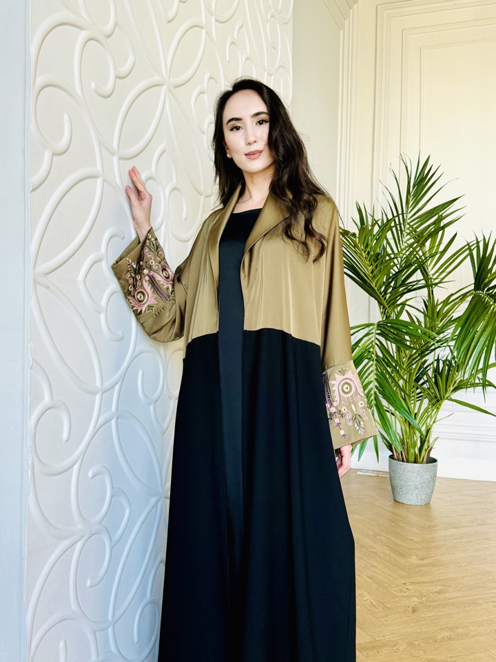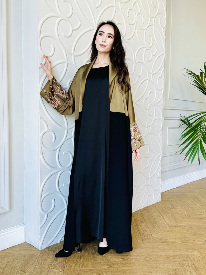 Абая из шелка с вышивкой , размер 46-52, длинна макси. Прилагается палантин. Базовое платье не входит в комплект . Производство Катар .