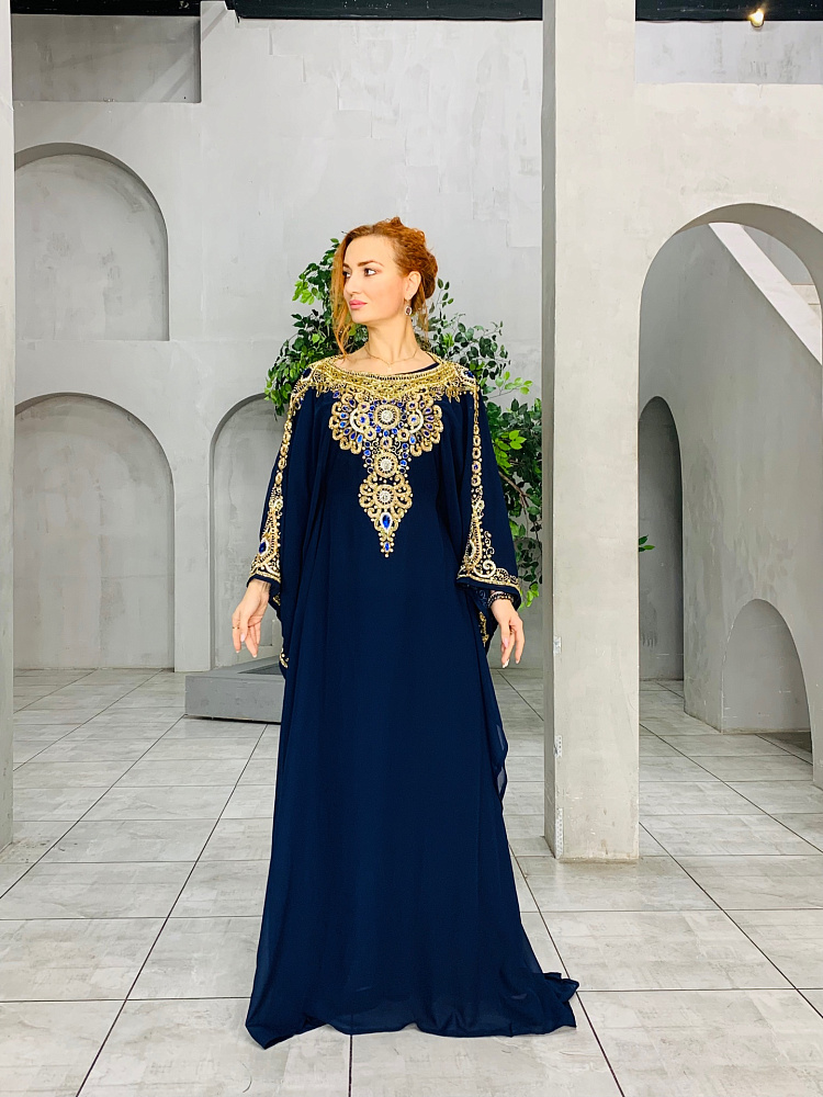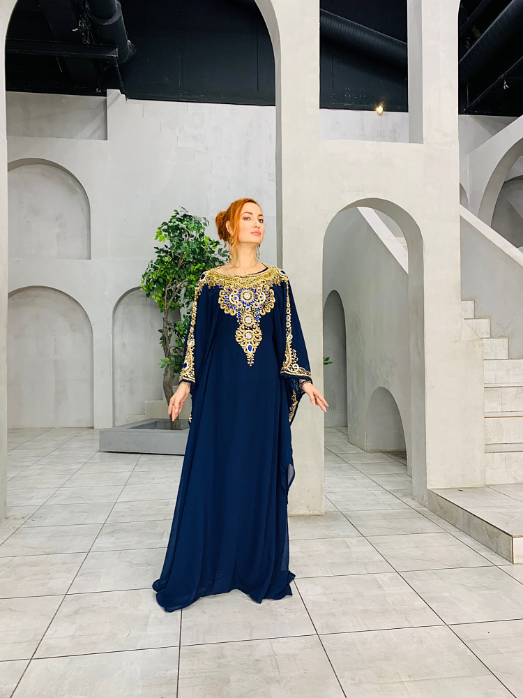 Шикарная абая с богатой вышивкой и декором из камней . Размер единый от 44 до 54. Ткань шифон. Состоит из нижнего и верхнего платья с вышивкой ручной работы. Внутри кулиски в зоне талии. Длина до 150см. Производство ОАЭ