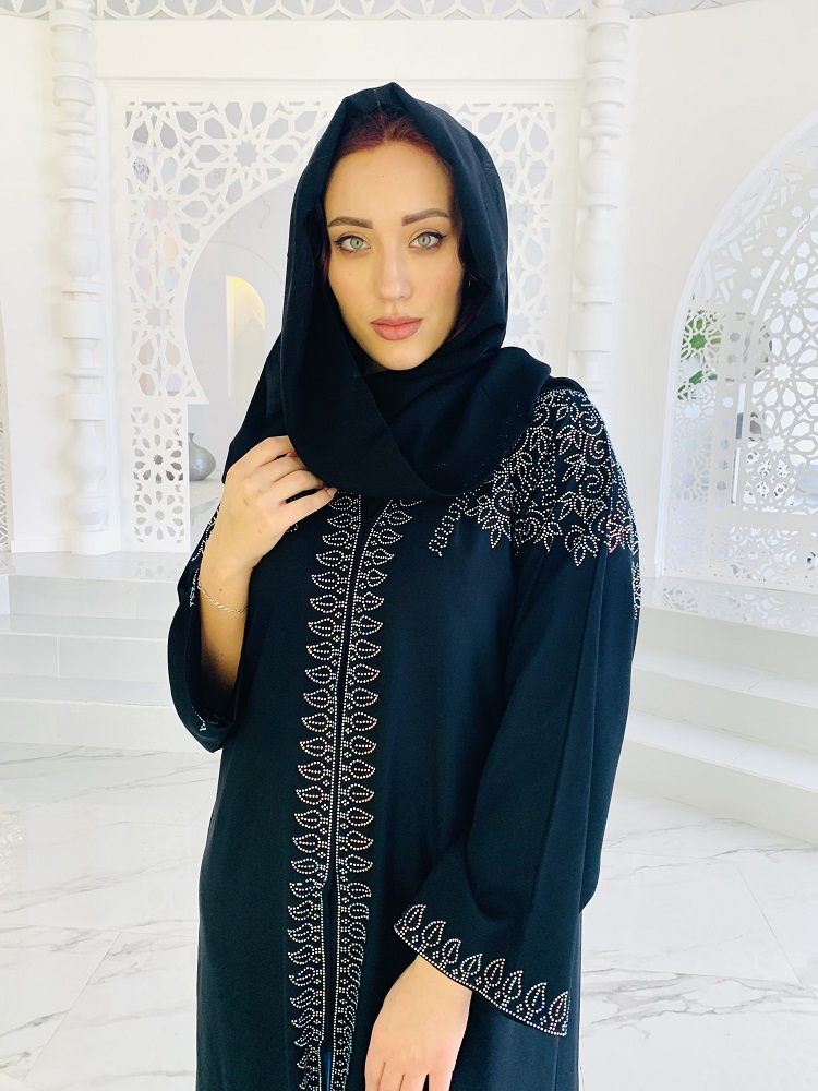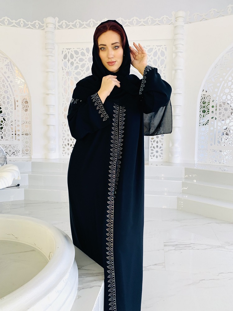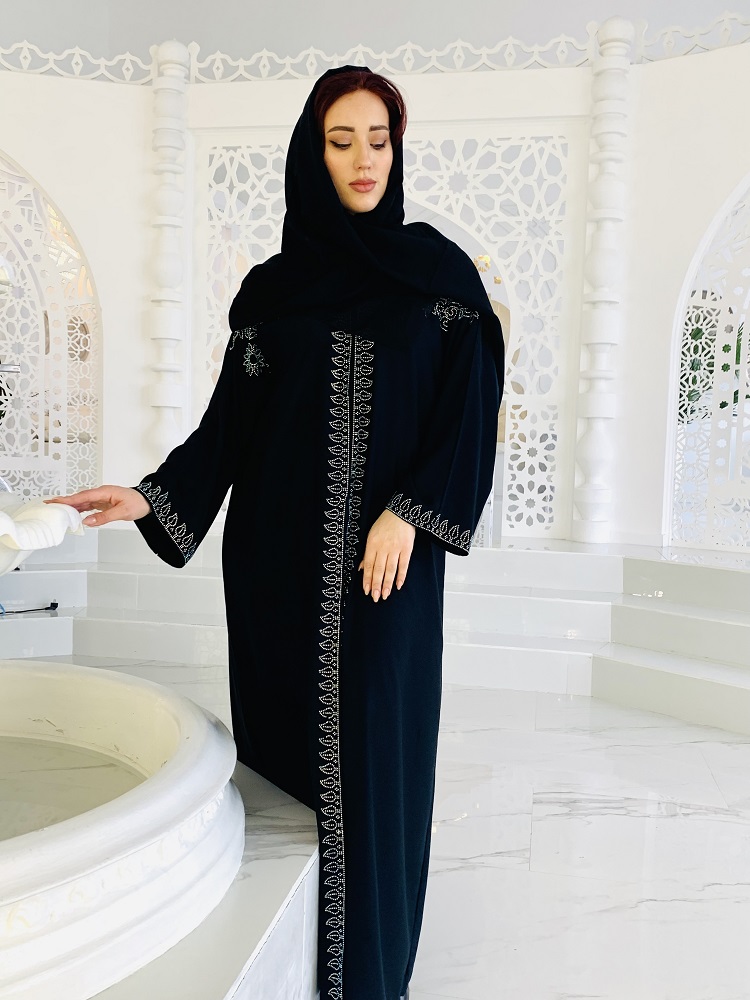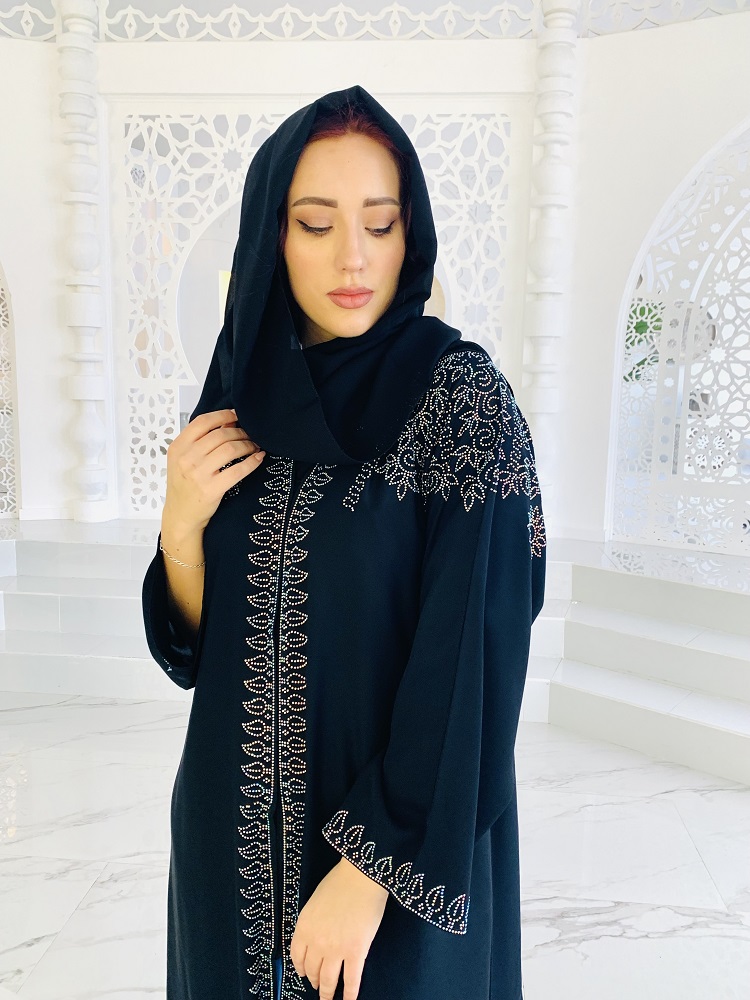 Абайя черного цвета украшена стразами. На кнопках, распахивается. Размеры 46-48-50-52. Прилагается палантин. производство ОАЭ