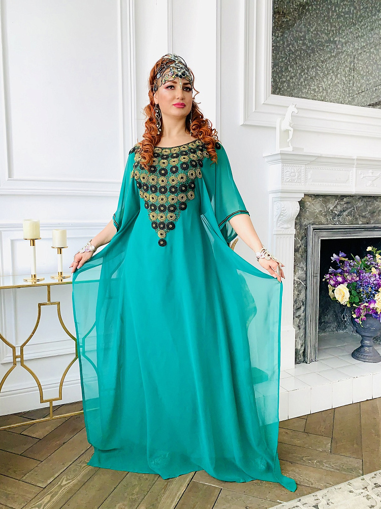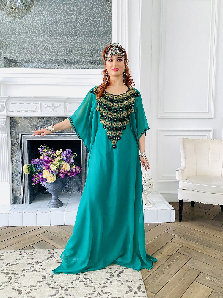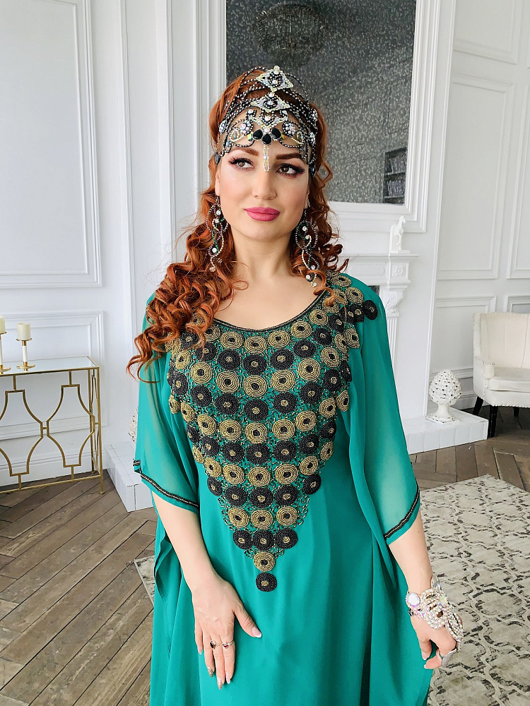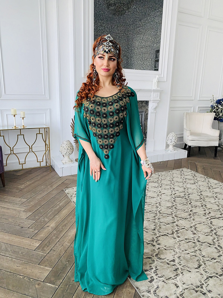 Красивая абайя изумрудного цвета с золотой и черной вышивкой бисером. Размеры 42-62. Производство ОАЭ