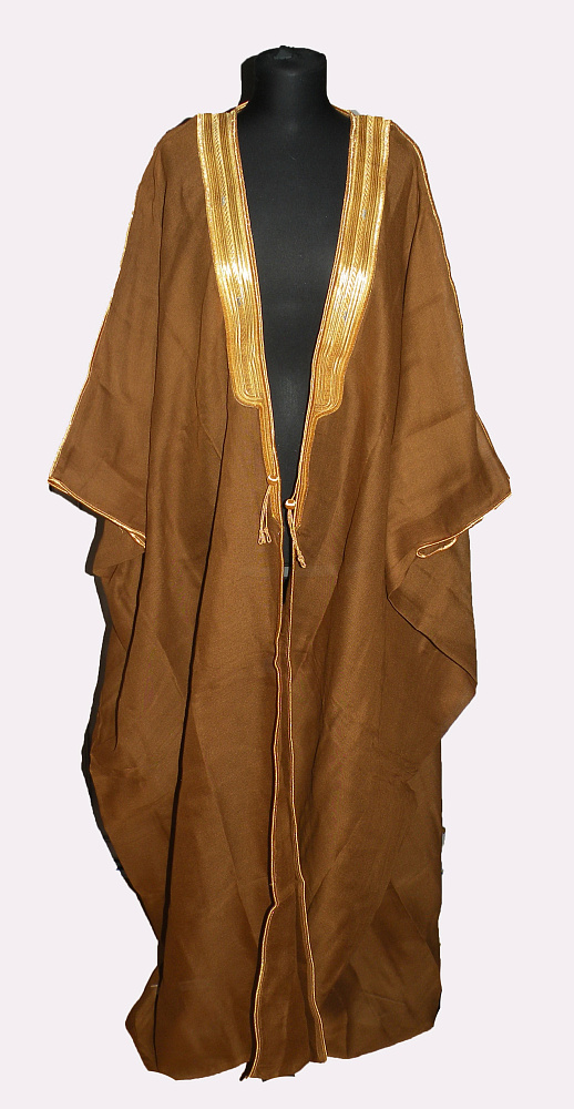 Благородная абайя коричневого цвета обработана богатой золотой лентой. Свободного покроя. Производство ОАЭ