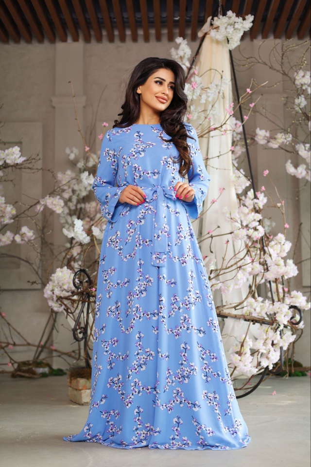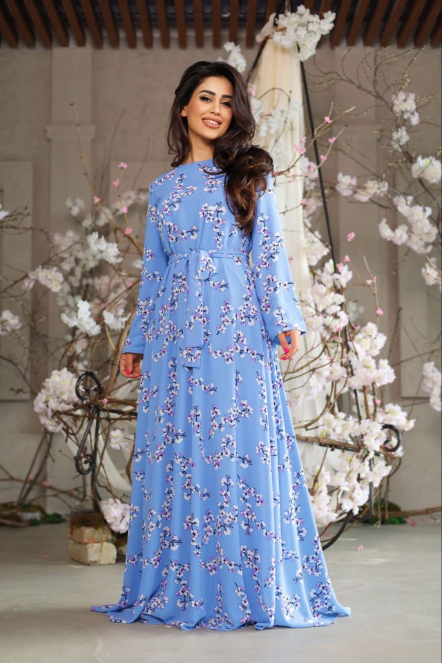 Летнее легкое платье Ираида из струящейся ткани прада . Нежный принт на ткани выполнен в голубых оттенках с цветочным принтом . Размер 46-48. Длина макси. Модель подойдет, как мусульманским модницам, так и девушкам других конфессий, кто любит длинные платья