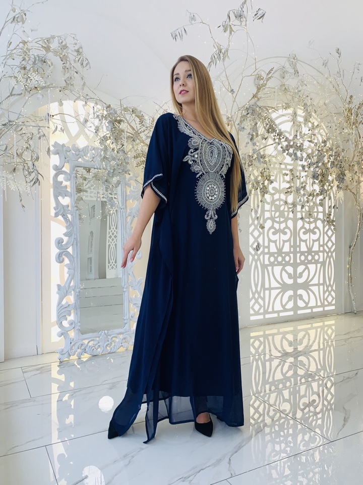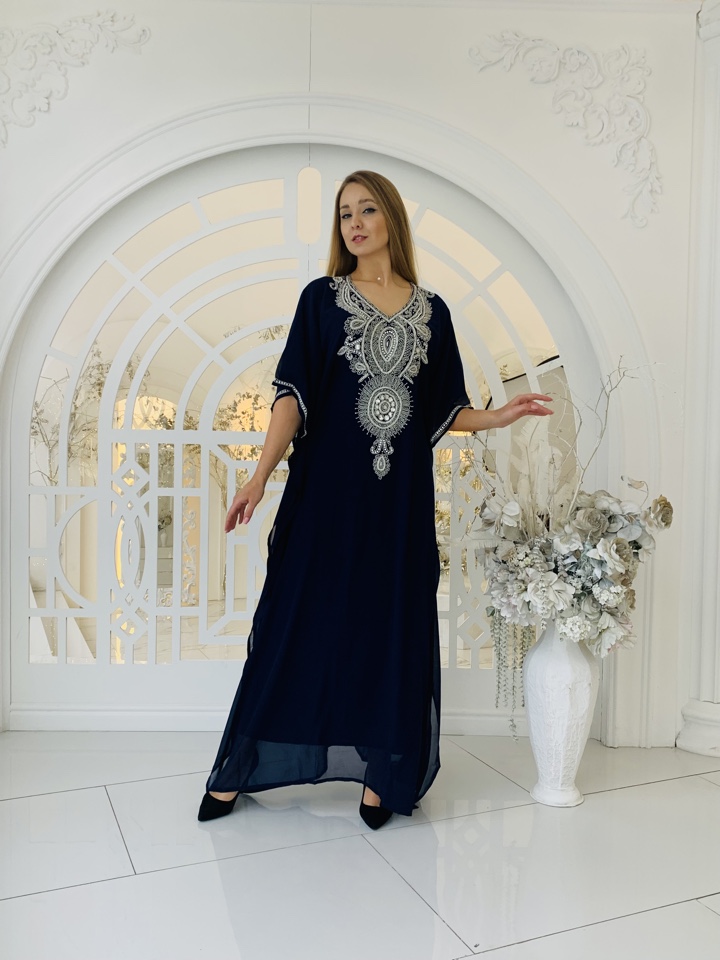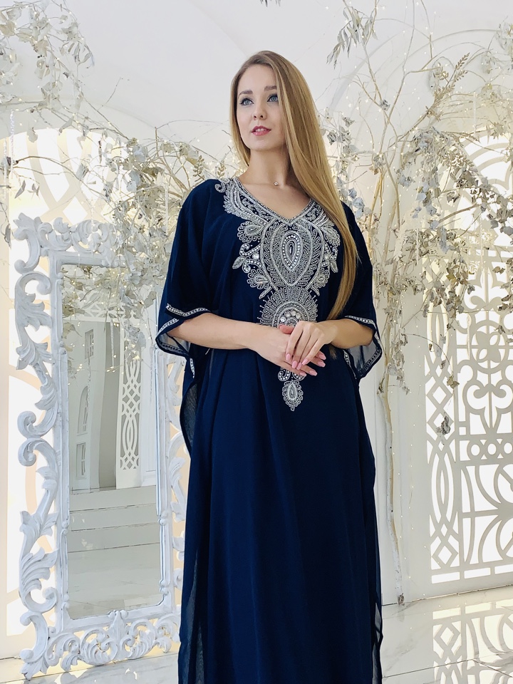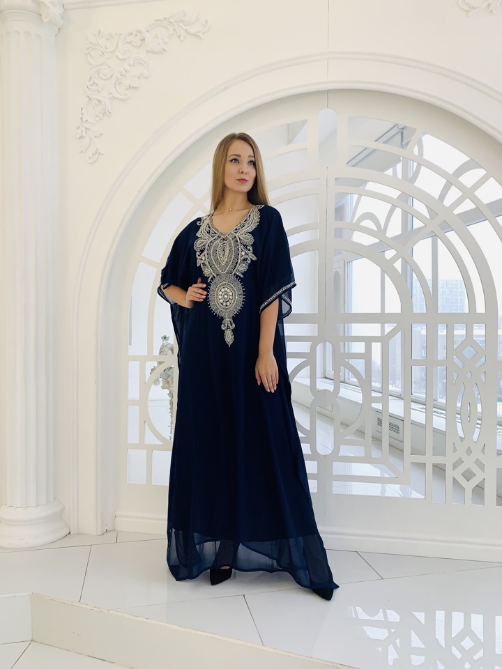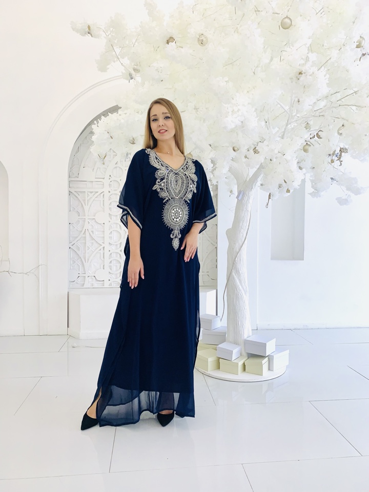 Эксклюзивная абая ,с вышивкой ручной работы. Декорирована камнями и стразами. Регулируется по фигуре ,с помощью завязок внутри абаи. Ткань-наилегчайший шифон. Размер от 44-52.Производство ОАЭ.