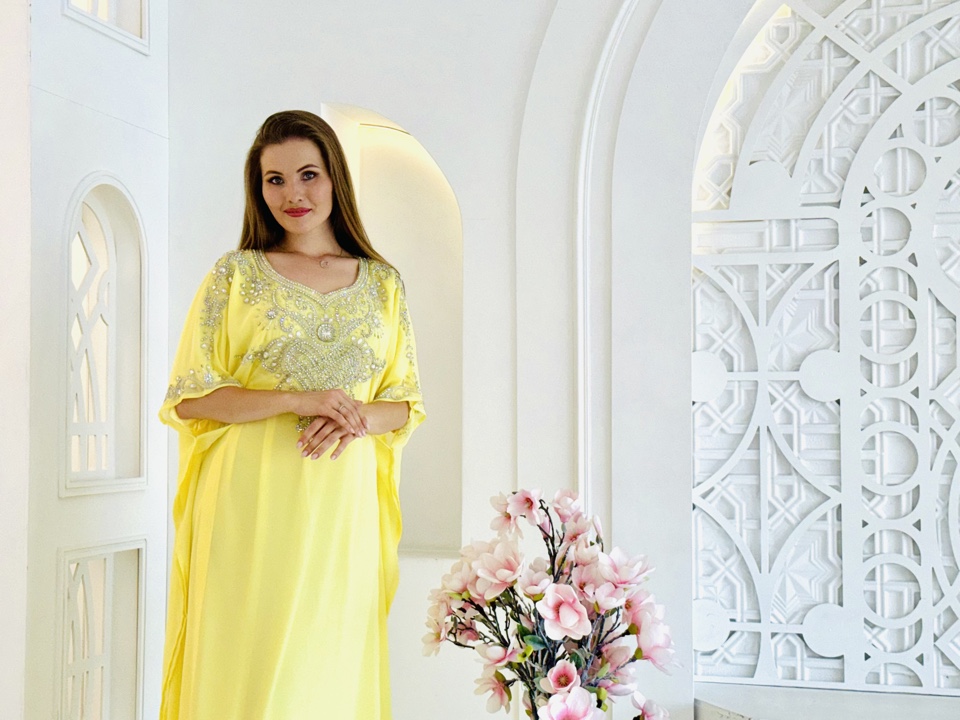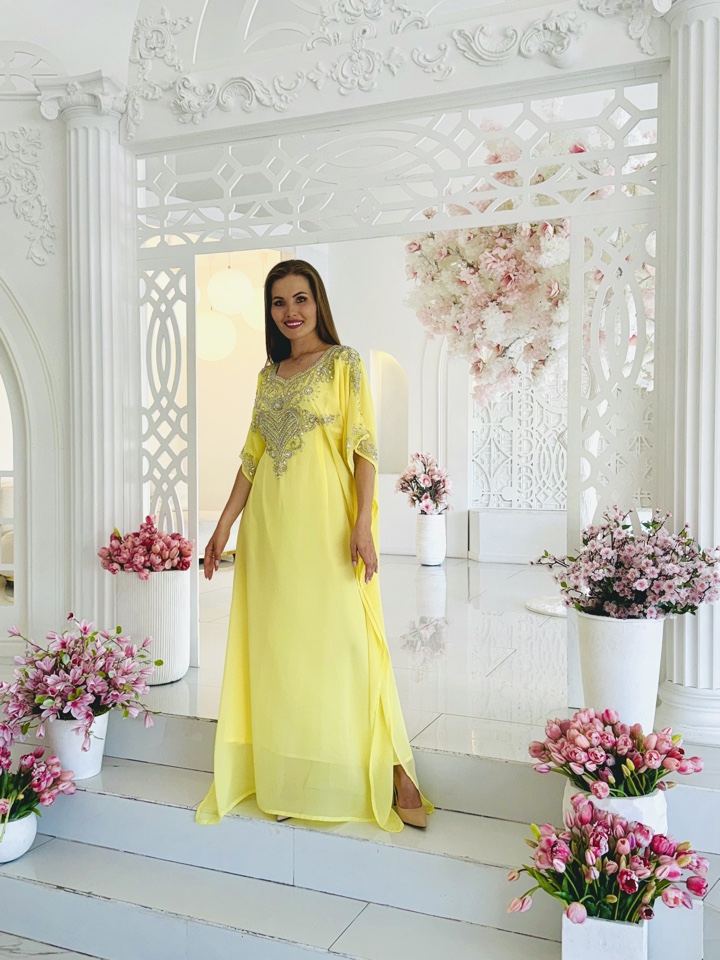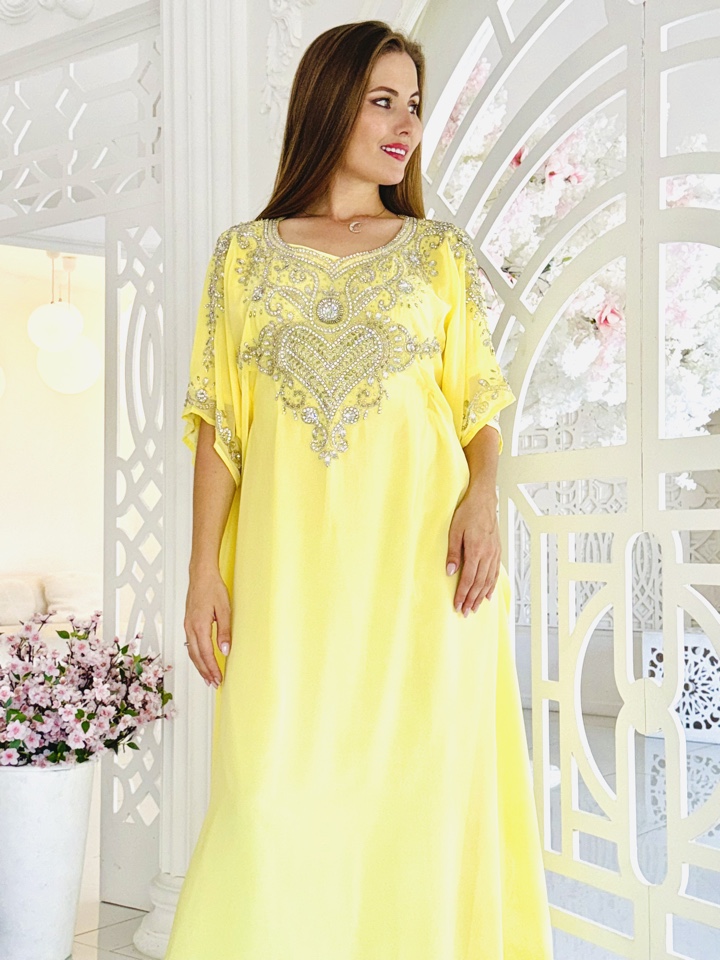 Нежный лимонный оттенок шифона безусловно покорит взоры окружающих и не оставит равнодушным обладательницу данной абаи