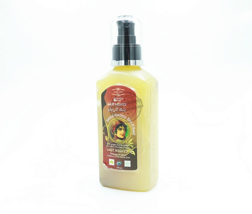 Насыщенный комплексный состав энергетического шампуня Bint Al Raml «Дочь песчаной дюны» с маслом имбиря и жиром кобры Национального сирийского производства восточной косметики East Nights разработан для питания и восстановления ломких, тусклых, безжизненных волос. Также шампунь применяется для прекращения выпадения и активизации роста волос. Это настоящий энергетический коктейль из множества ценных компонентов.