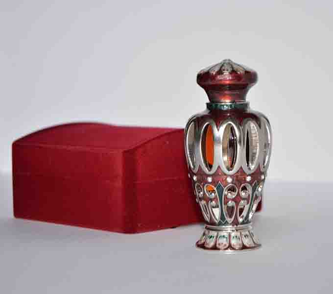 Стеклянный флакон в оправе из металла с эмалью. объем 18 мл