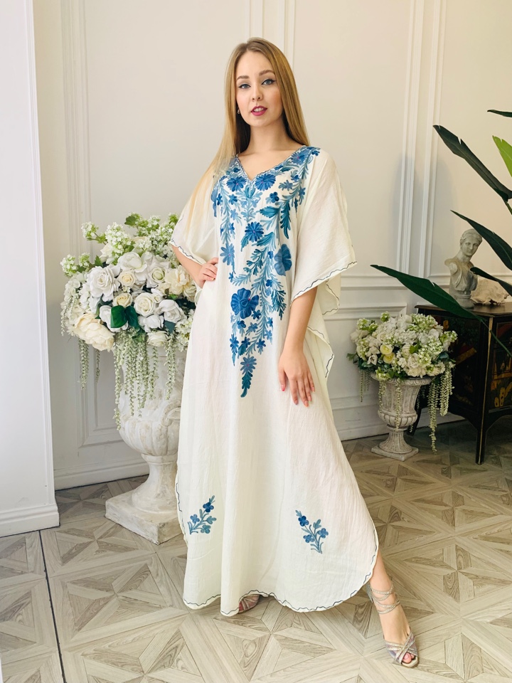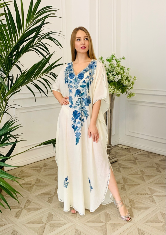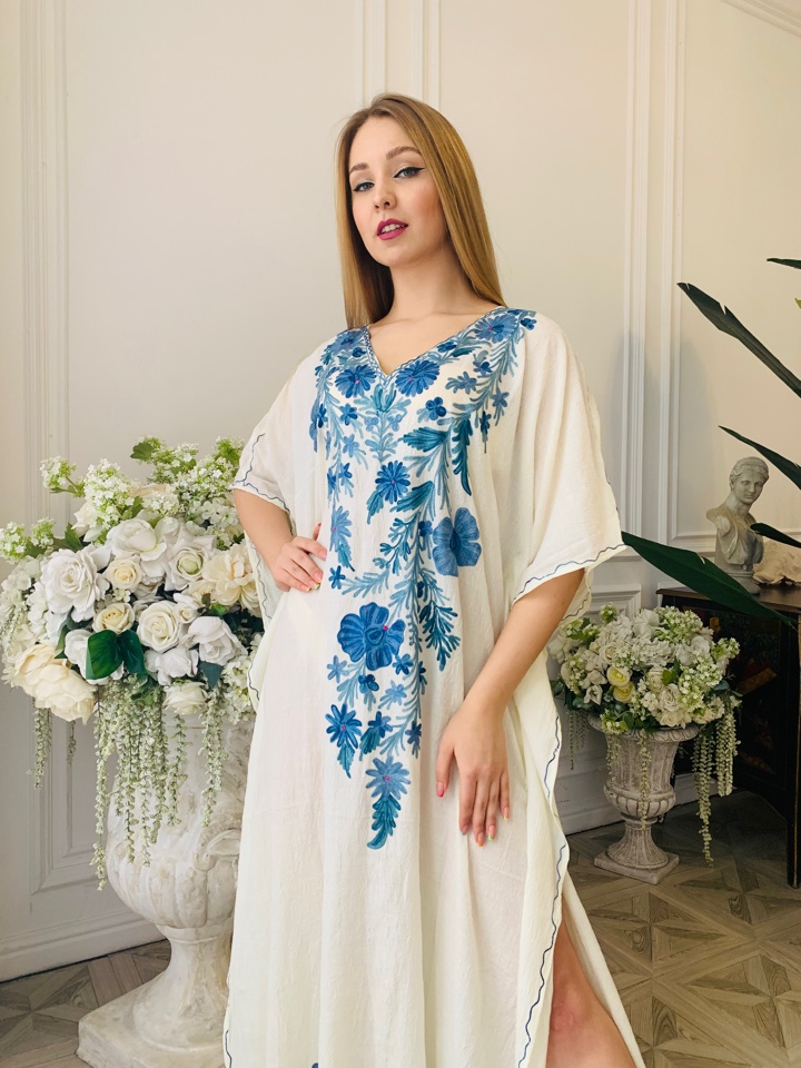 Галабейя выполнена из высококачественного натурального жатого хлопка, вышивка из кашемира. Размер 46-48-50-52-54.