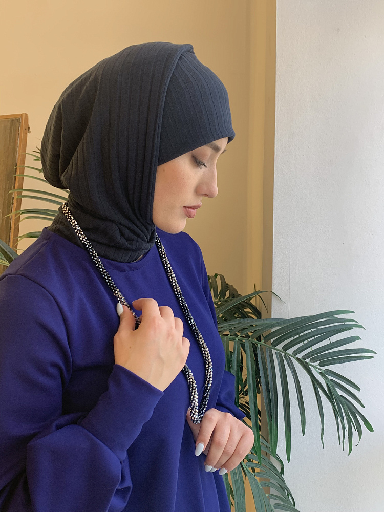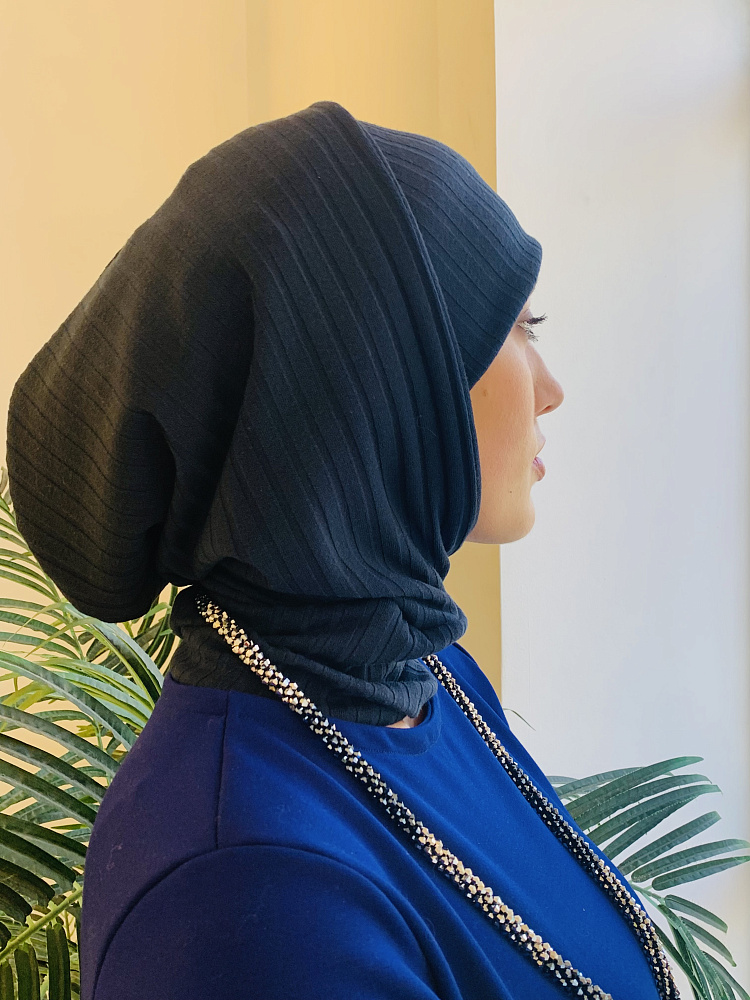 Стильный комплект трансформер - шапка и балаклава из трикотажа лапша темно-синего цвета.
