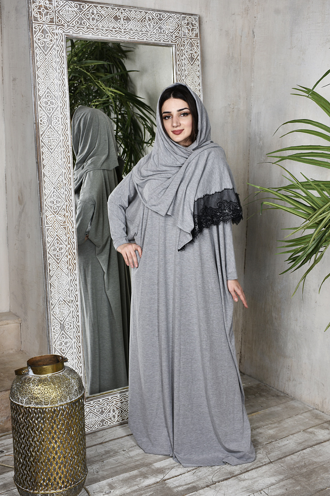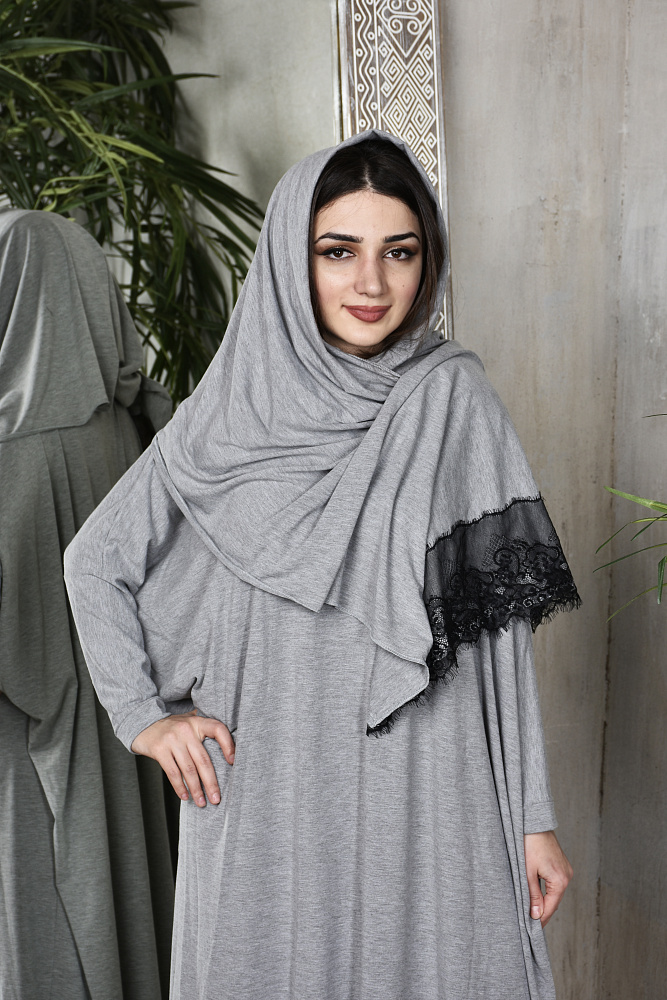 Красивое платье для молитвы из вискозы серого цвета с красивым кружевом. Размер 44-56. Производство Ателье Фатмафэшн