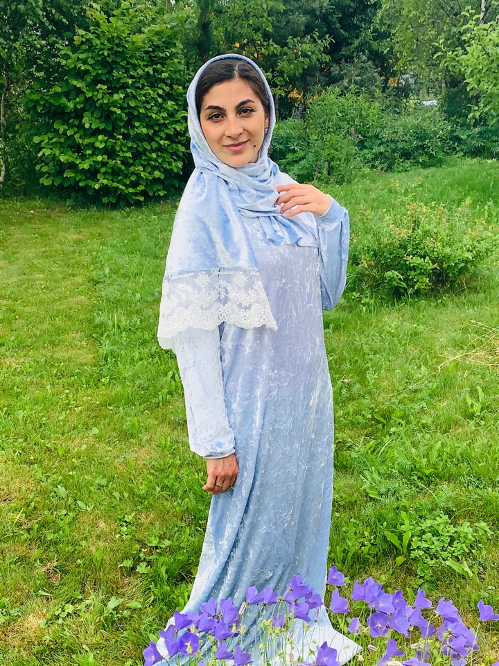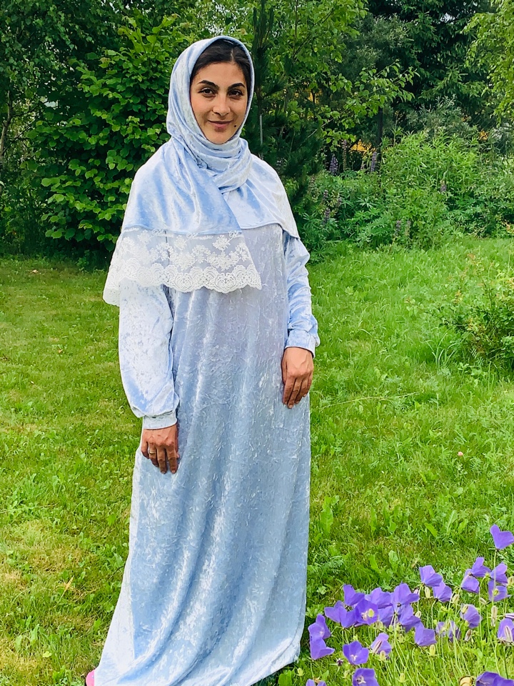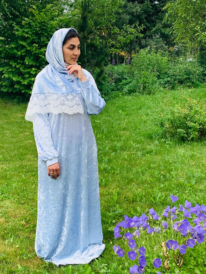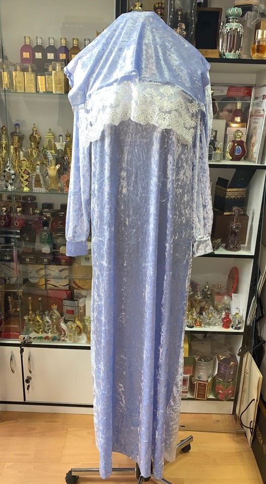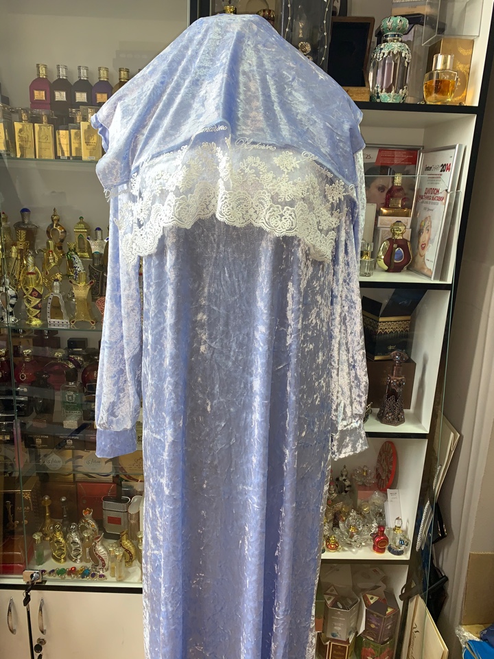 Роскошная издаль - платье для молитвы из велюр , небесно-голубого цвета с переливом, платье декорировано белым кружевом, палантин вшит в платье. Размеры от 44-52.