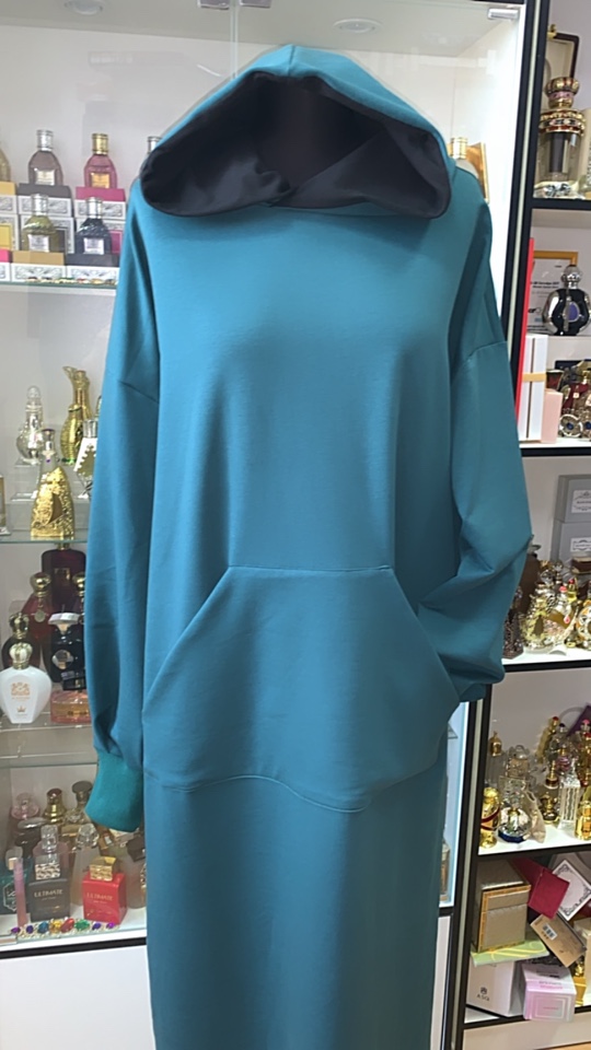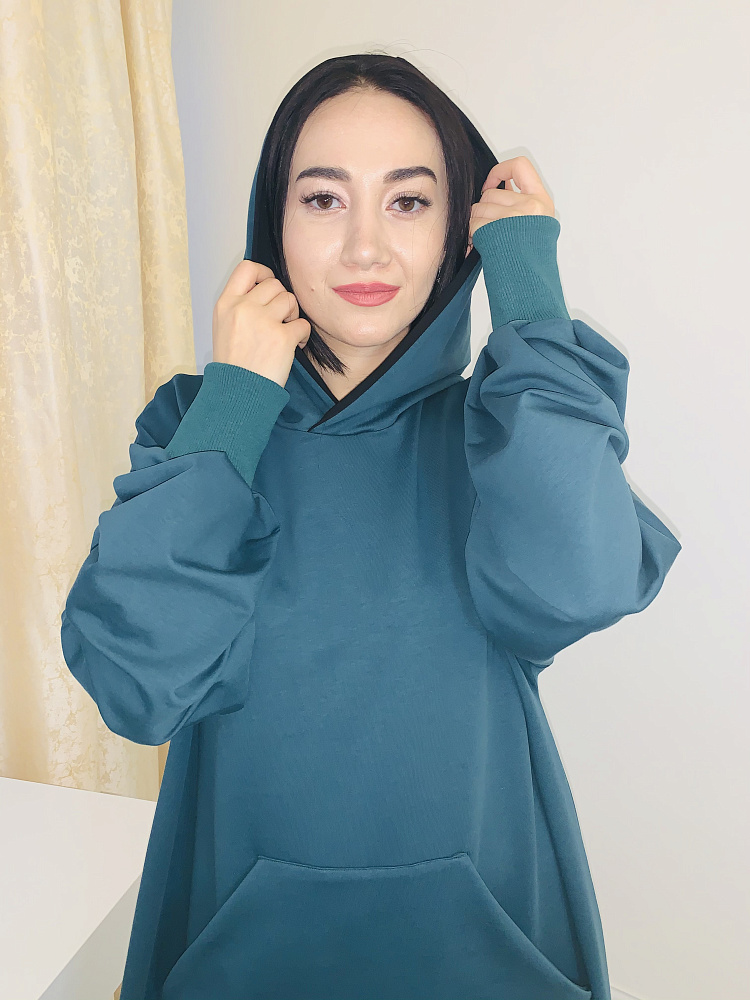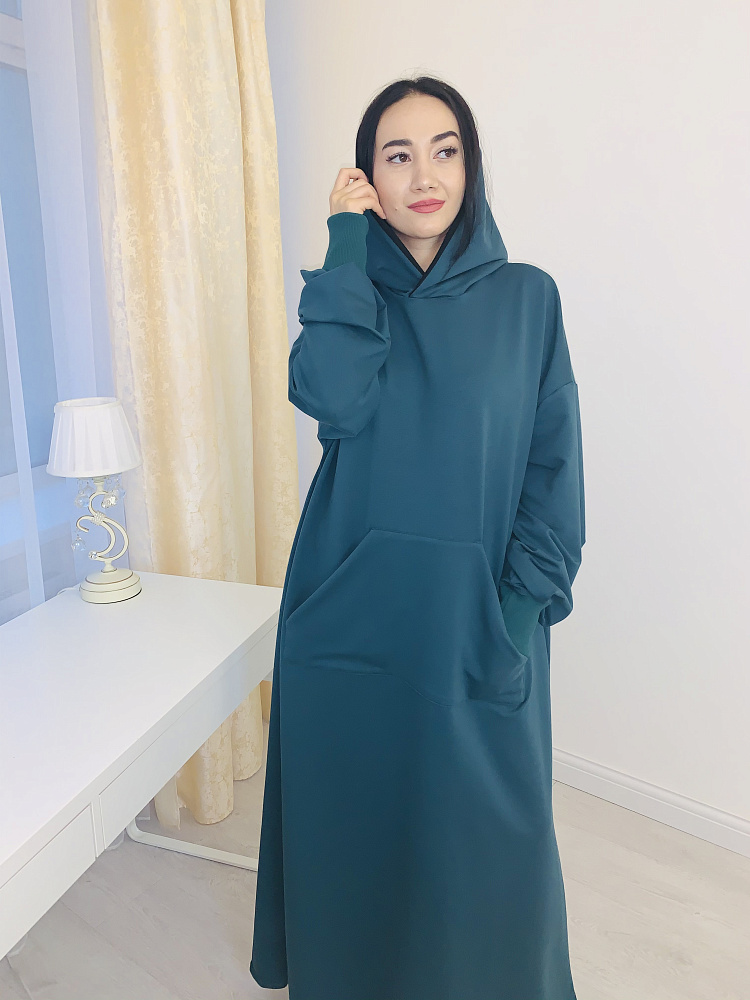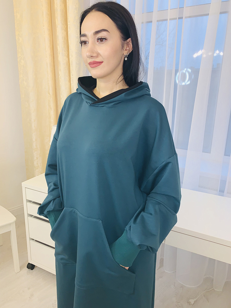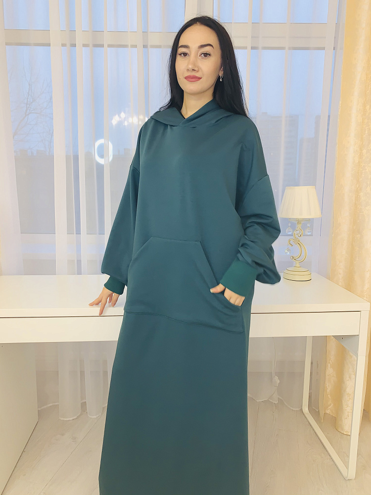 Стильное платье худи оверсайз с карманом впереди, изумрудного цвета из футера. Платье с капюшоном, размер 46-48-50. Коллекция осень -зима- весна. Длина платья 145-147см.