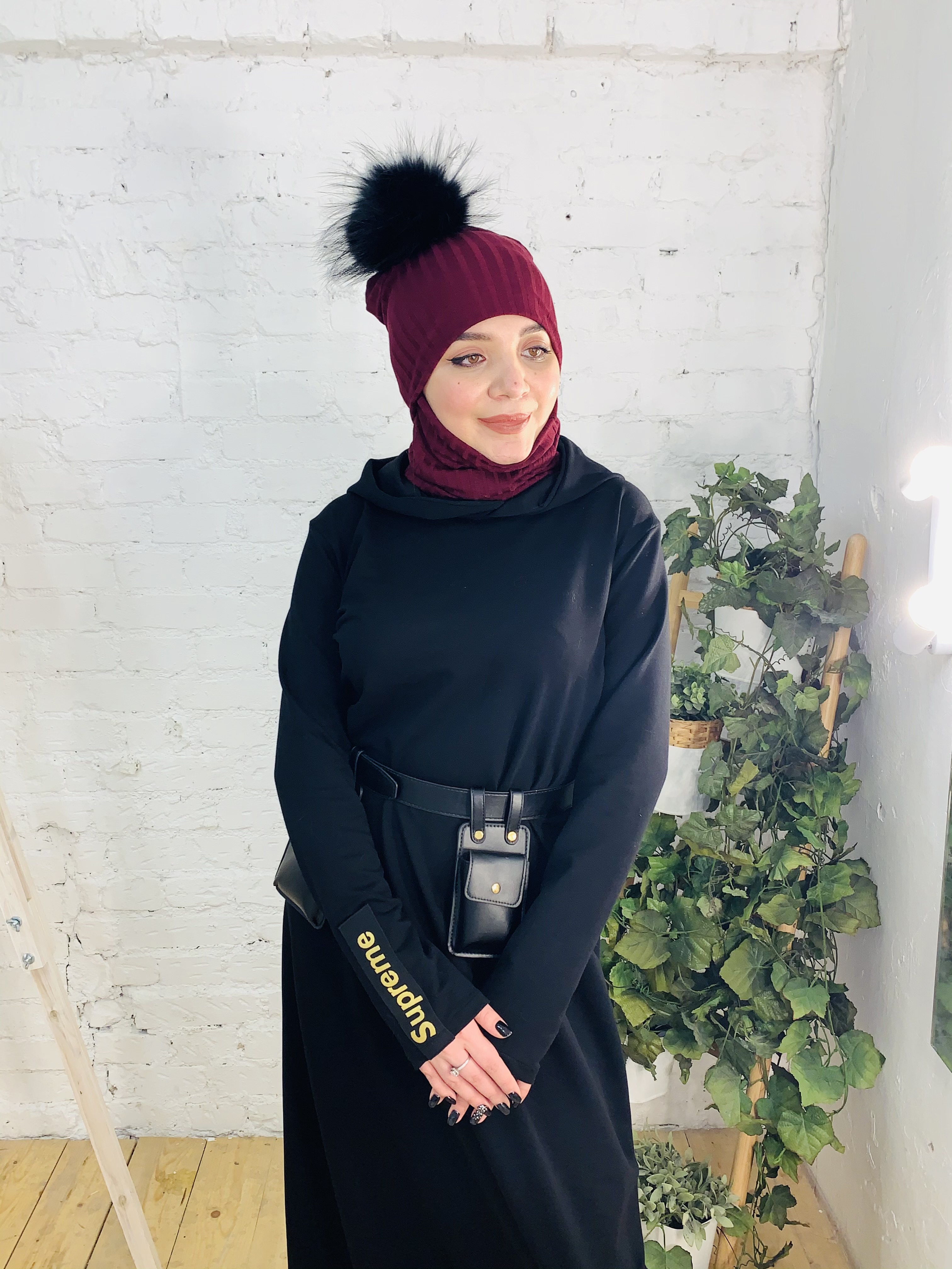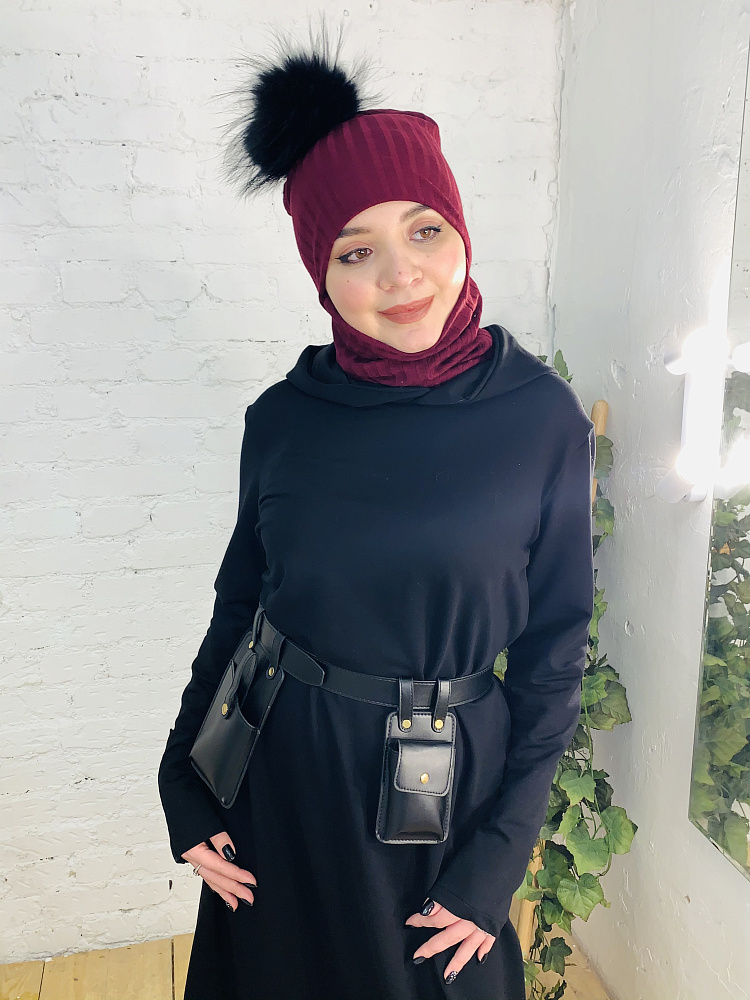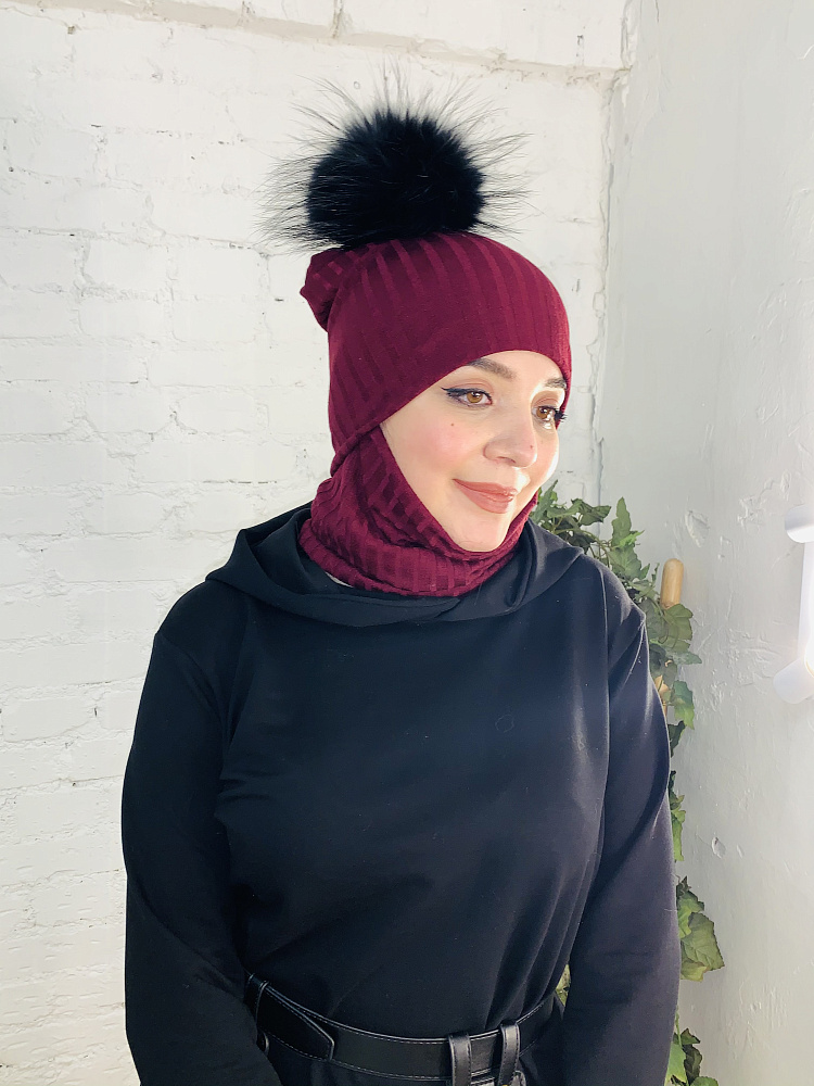 Стильный комплект трансформер - шапка и снуд-маска из трикотажа лапша бордового цвета. Снуд можно использвать, как снуд и как маску. Помпон из натурального меха енота черного цвета