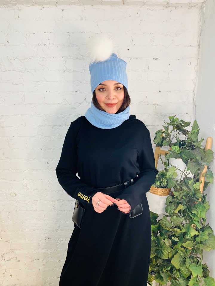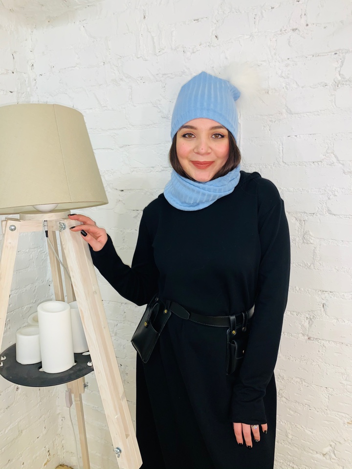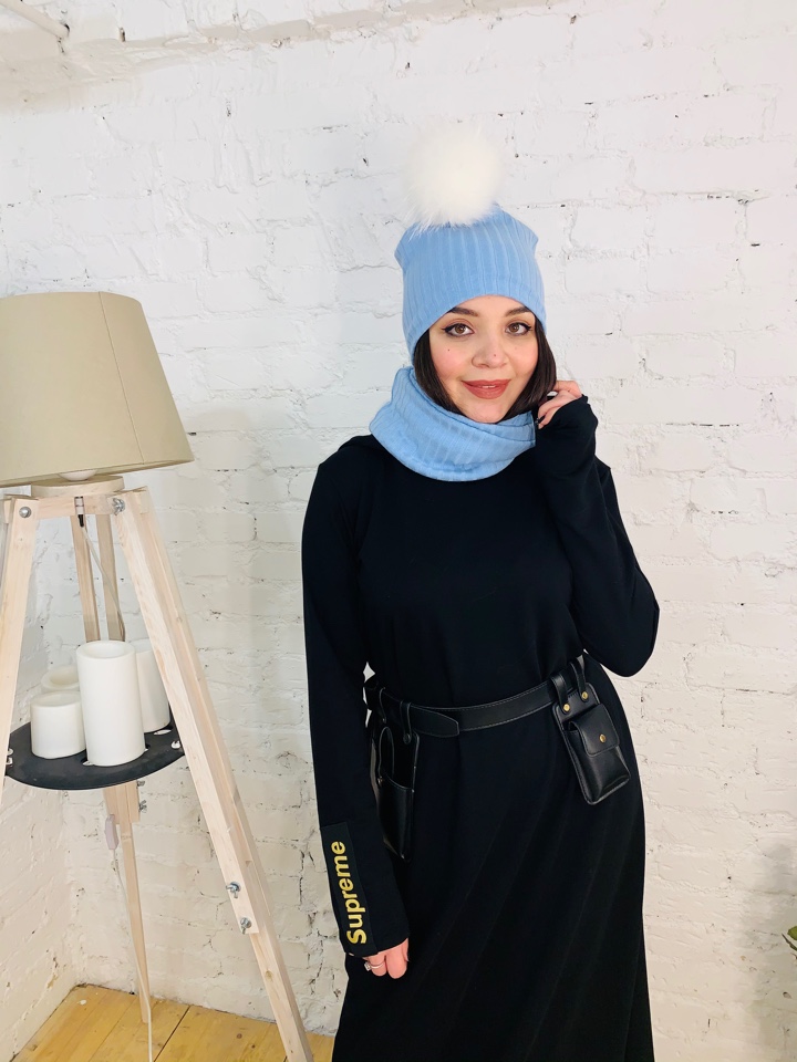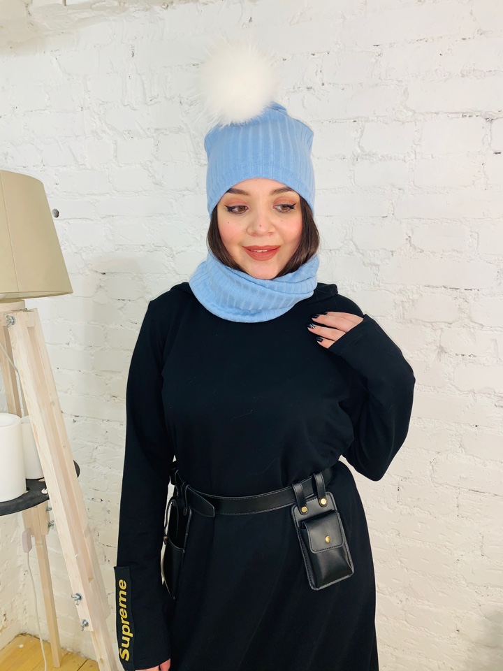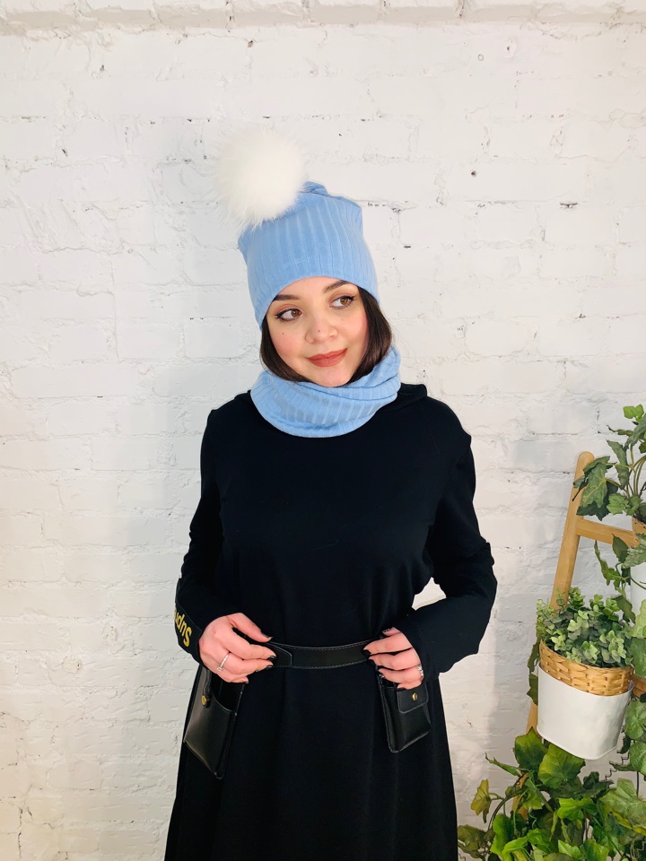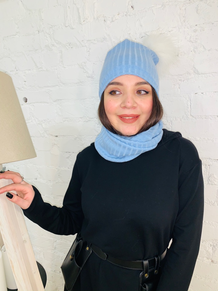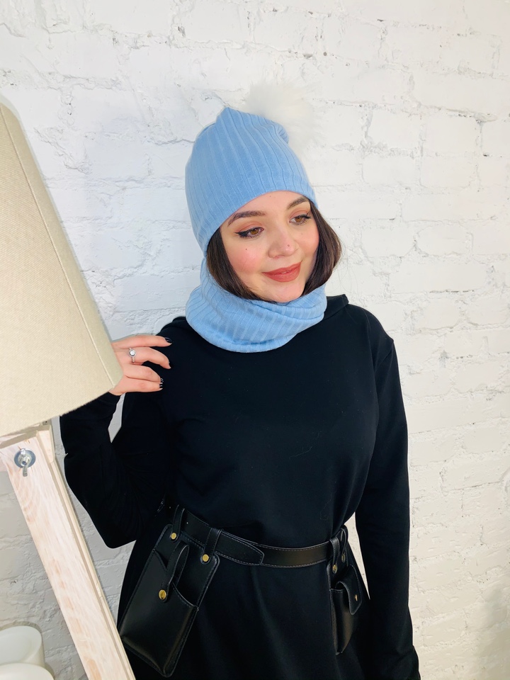 Стильный комплект трансформер - шапка и снуд-маска из трикотажа лапша небесно-голубого цвета. Снуд можно использвать, как снуд и как маску. Помпон из натурального меха енота белого цвета