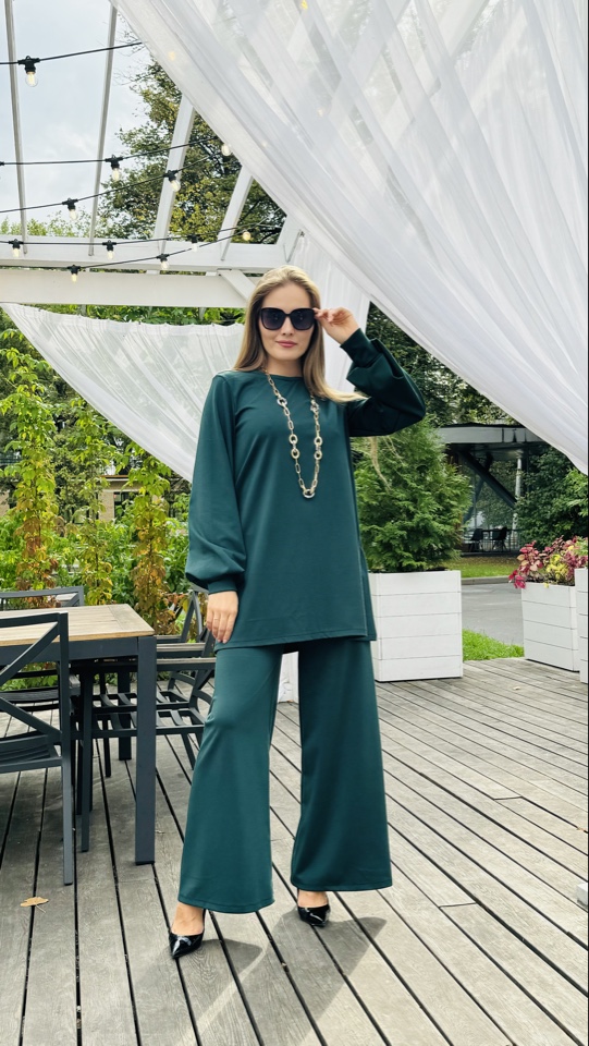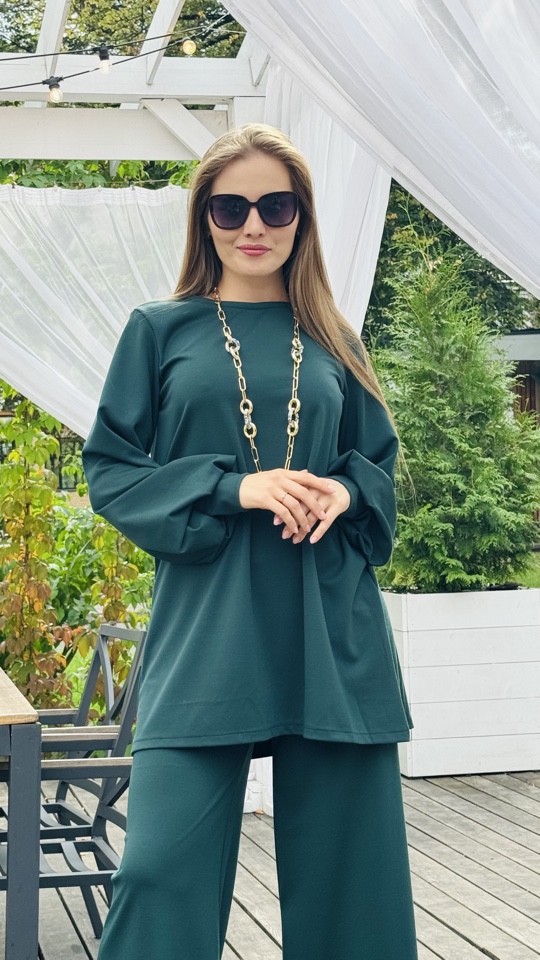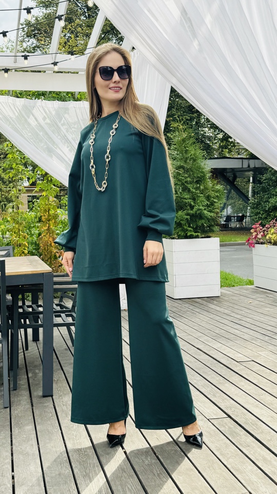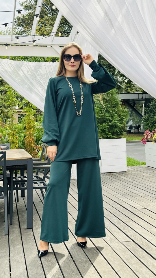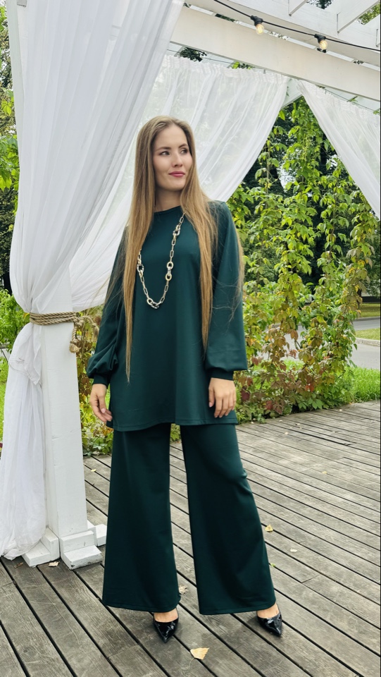 Костюм двойка, сделанный из мягчайшей ткани - трикотаж ромэ. Цвет- изумрудный. Размерный ряд от 44-50 р .Рост модели -175 см. Длинна изделия -макси. Производство Россия.