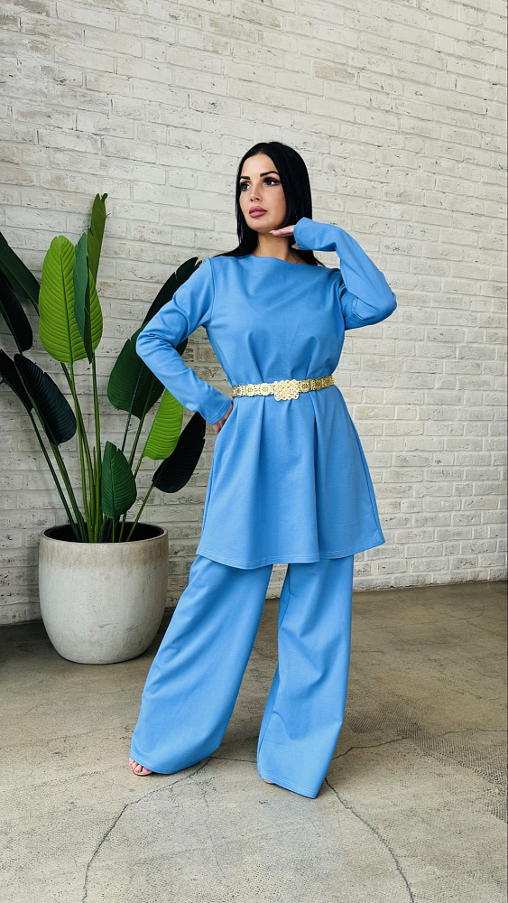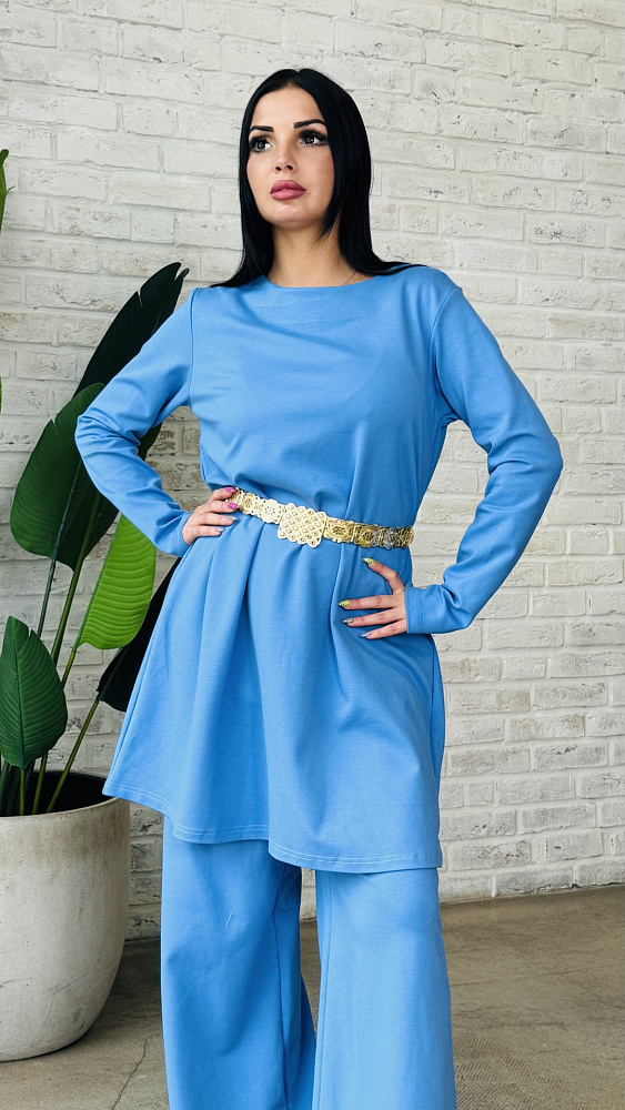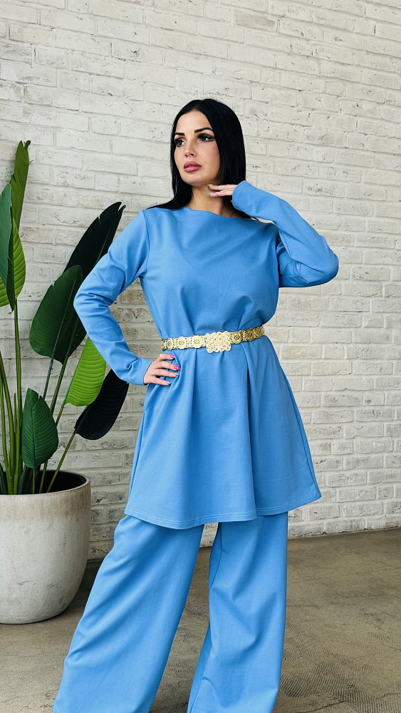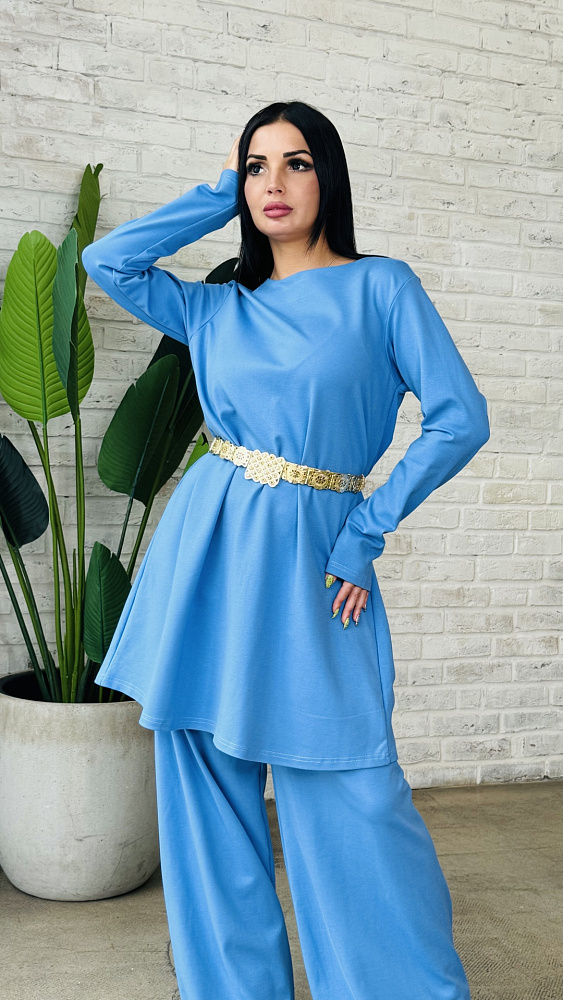 Костюм двойка, сделанный из мягчайшей ткани - трикотаж ромэ . Цвет- морская волна .Размерный ряд от 46-48 -50 р .Производство Россия