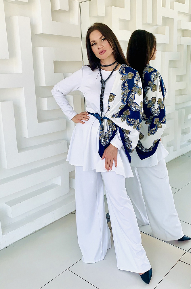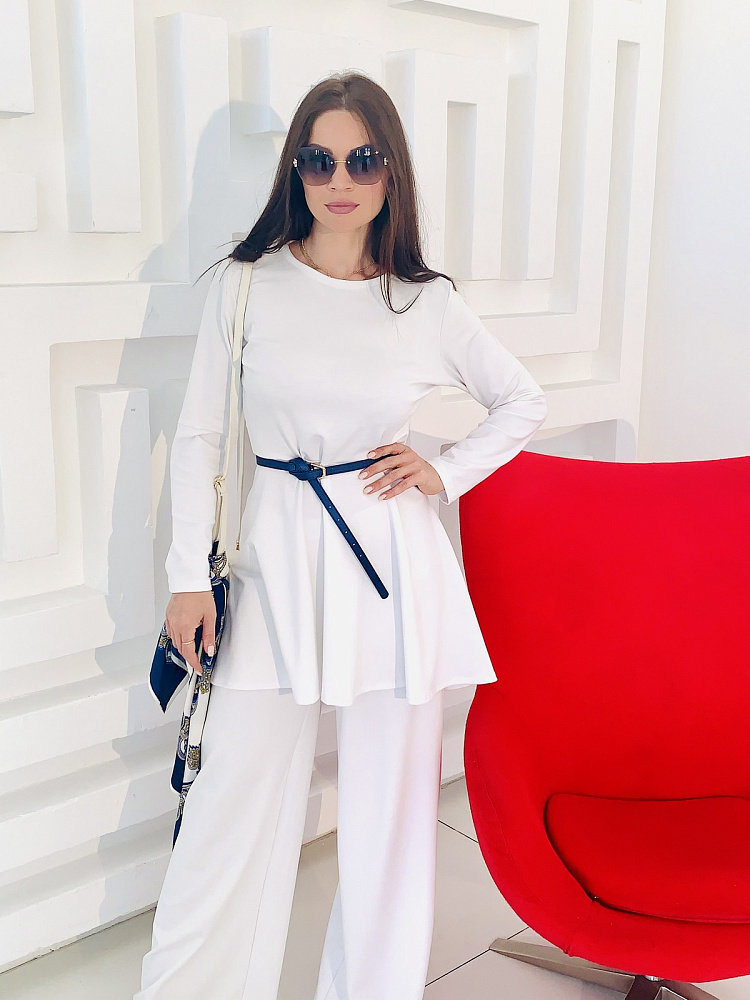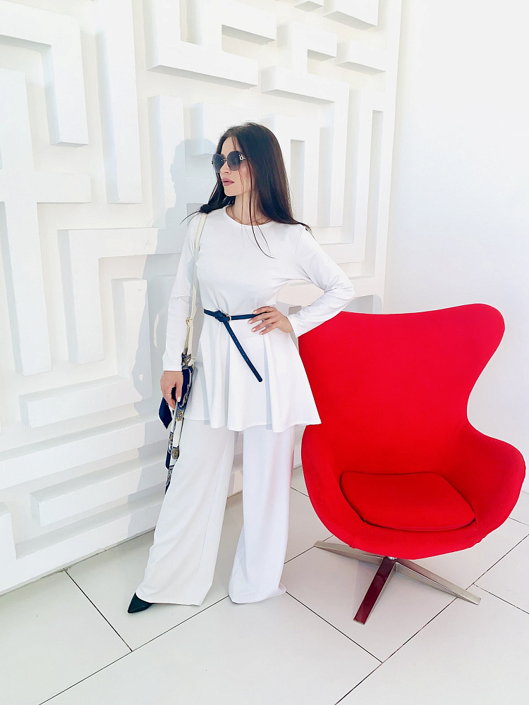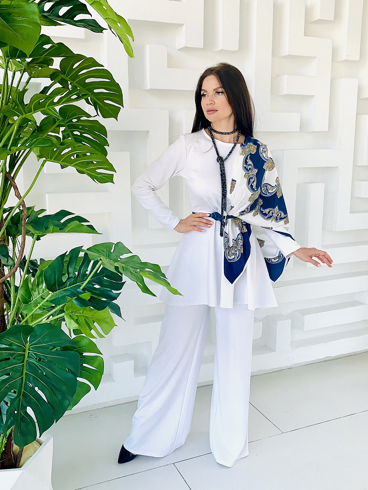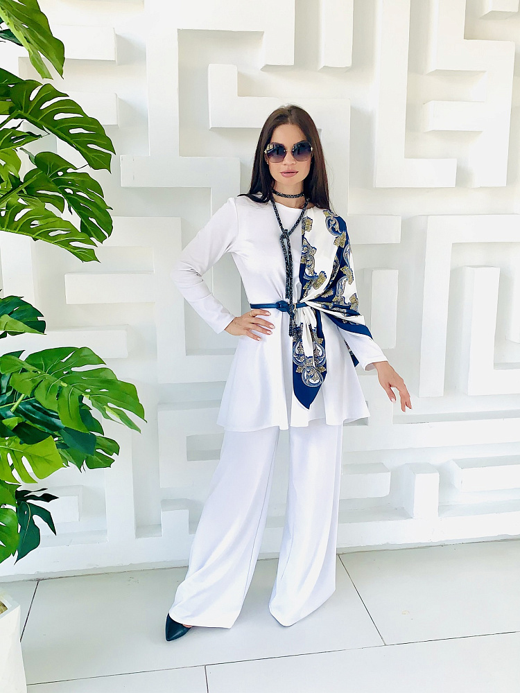 Женственный костюм - туника и широкие брюки белого цвета. Размер 44-46-48-50. Ткань - трикотаж ромэ. Аксессуары использовались для фотосесии. Платок можно приобрести в разделе - Головные уборы. Производство Ателье Фатмафэшн