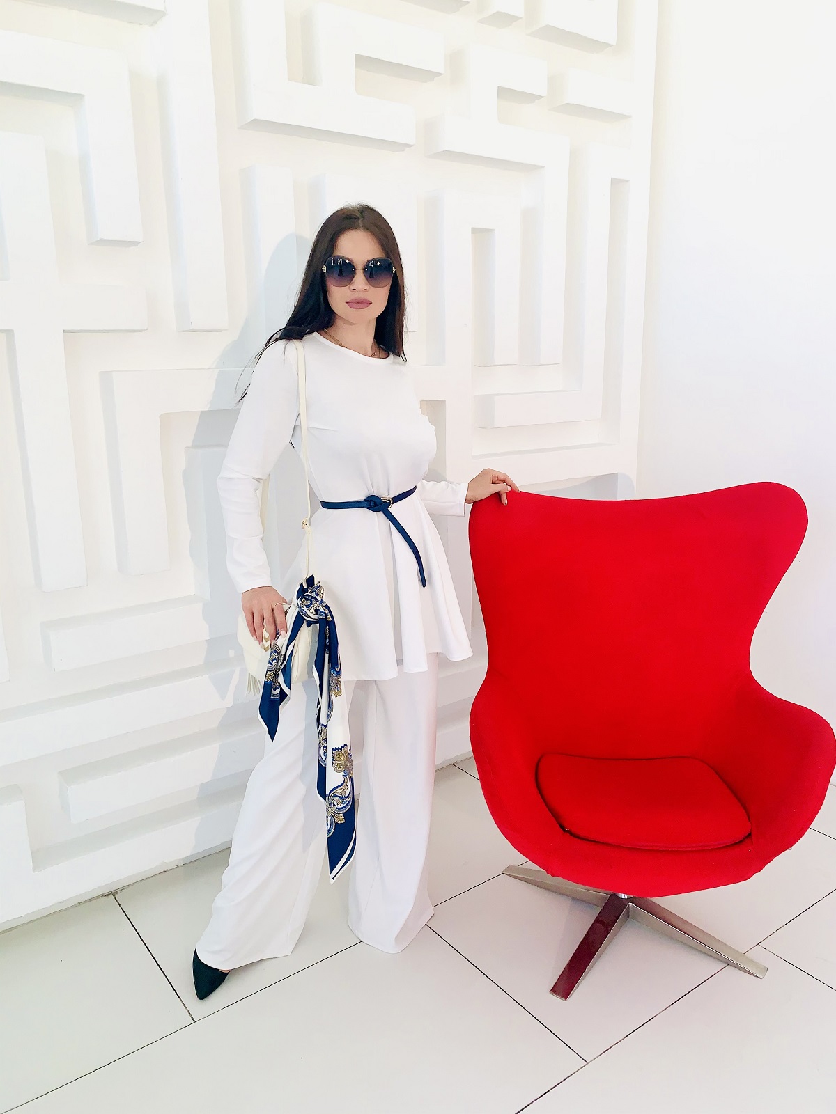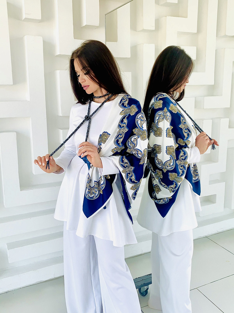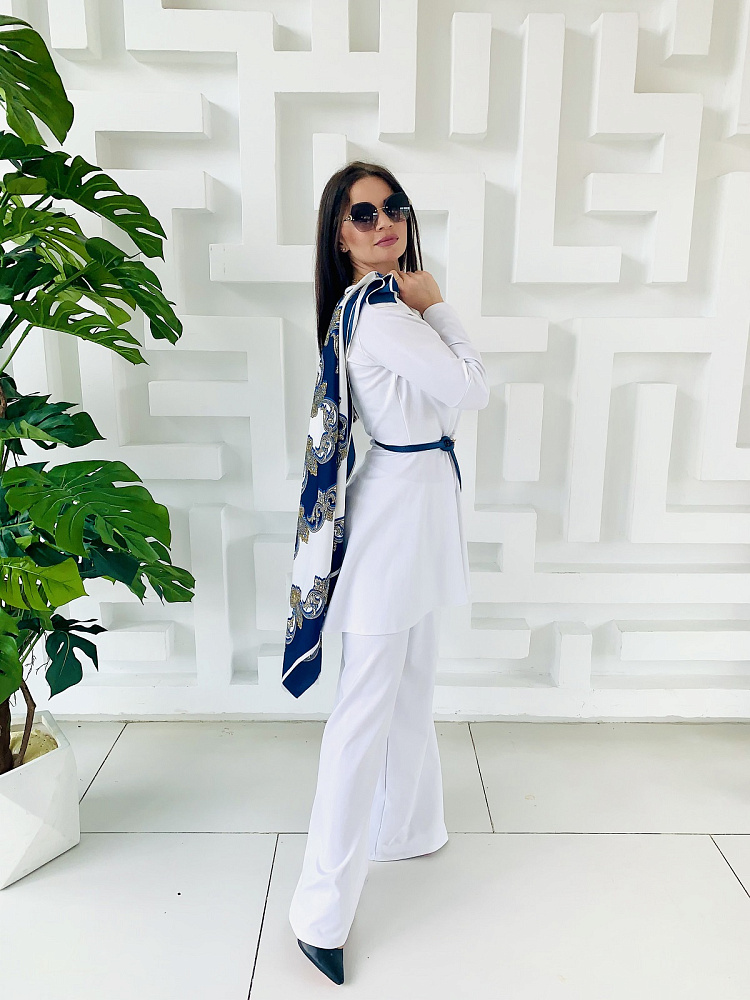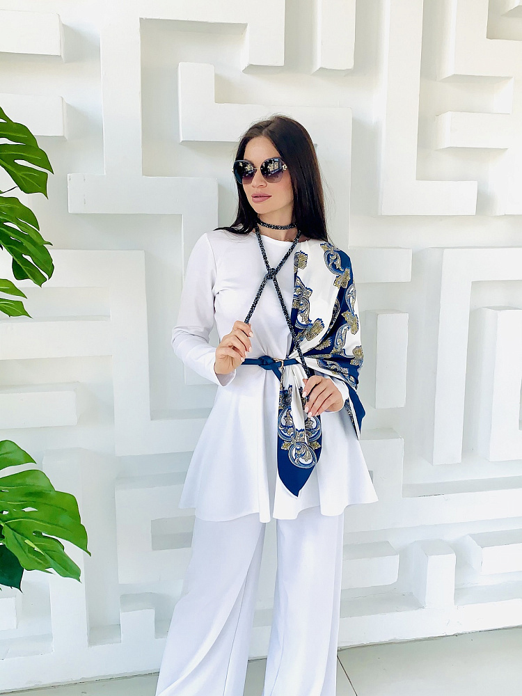 Женственный костюм - туника и широкие брюки белого цвета. Размер 44-46-48-50. Ткань - трикотаж ромэ. Аксессуары использовались для фотосесии. Платок можно приобрести в разделе - Головные уборы. Производство Ателье Фатмафэшн