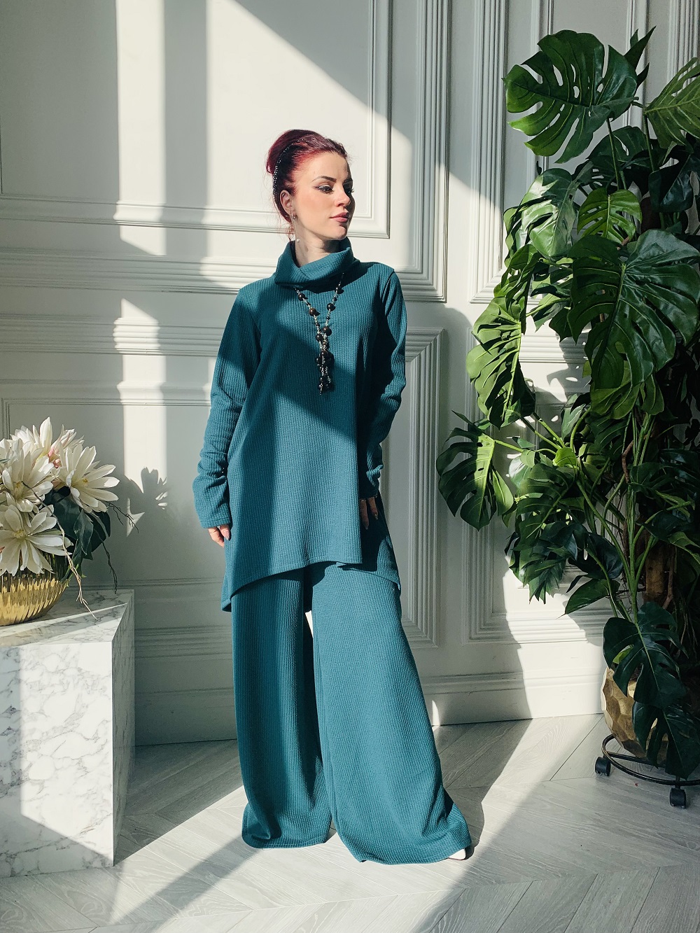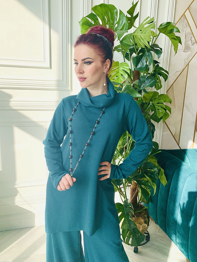 Стильный брючный костюм цвета хвои. Широкие брюки и туника. Размеры 46-48-50. Ткань - косичка. Украшения и пояс использовались для фото и в комплект не входят. Производство Ателье Фатмафэшн