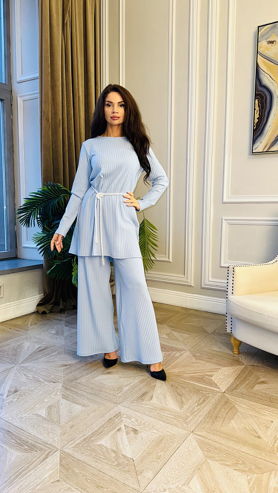 Комфортный костюм , сделанный из мягчайшей ткани - трикотаж лапша . Ткань не колется, не накапливает статику. Цвет- морская волна . Без декора ,что позволит его обладательнице носить его не только повседневно,но и на мероприятия. Размерный ряд данного от 46-48 -50 р , подразумевается тем самым ношение как Oversize . Рост модели 172 см , размер одежды 42 . Производство Россия