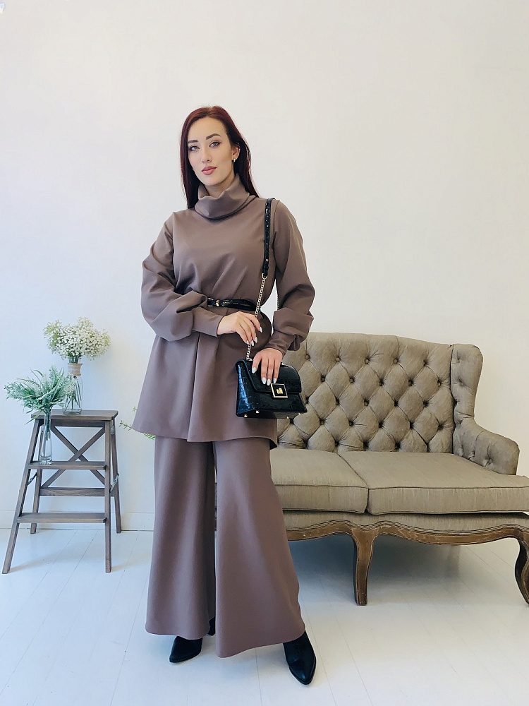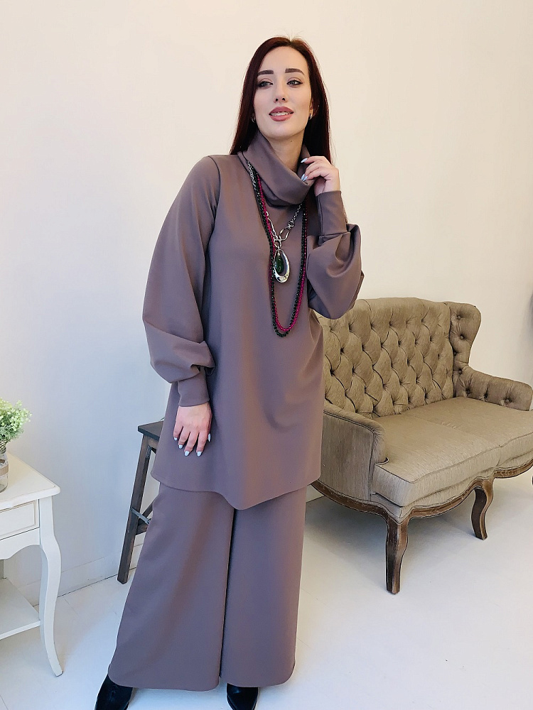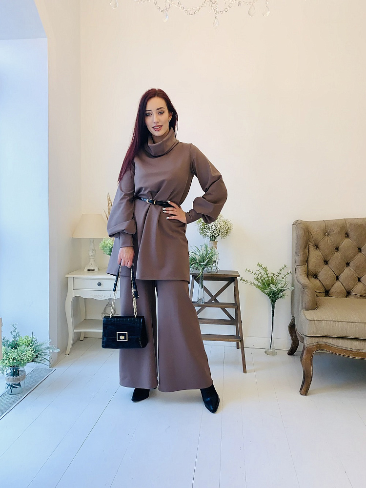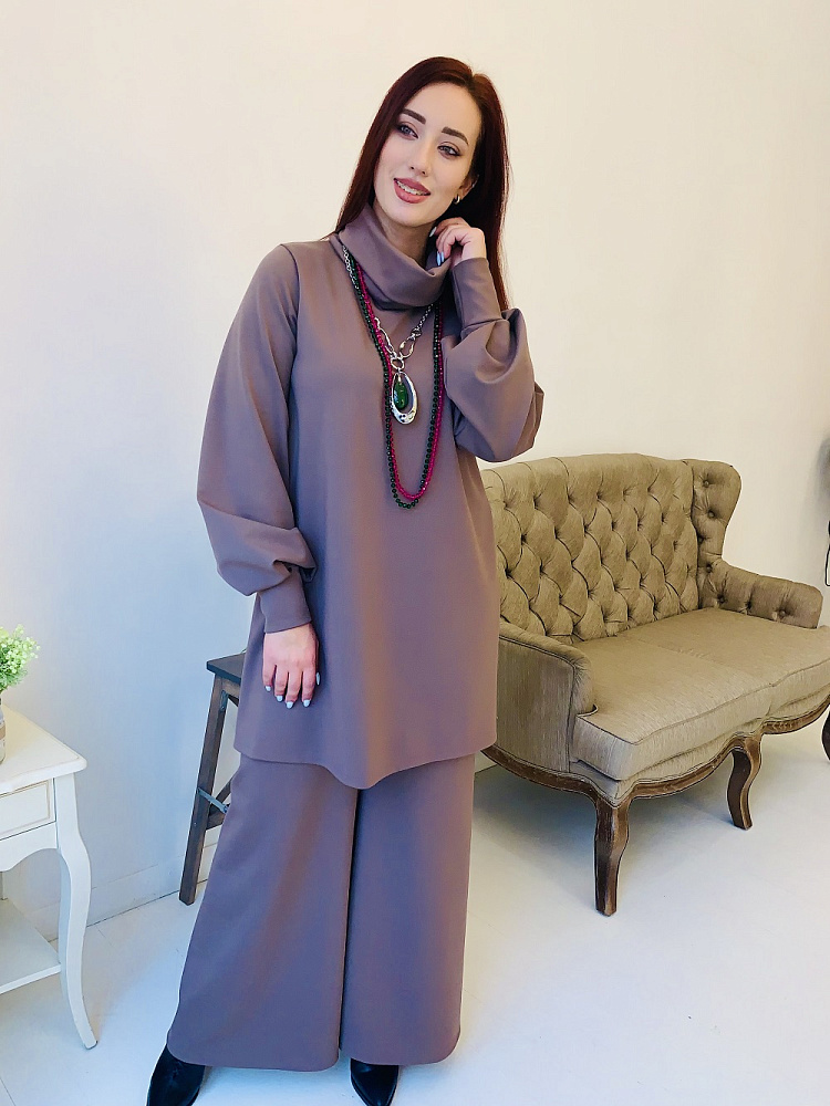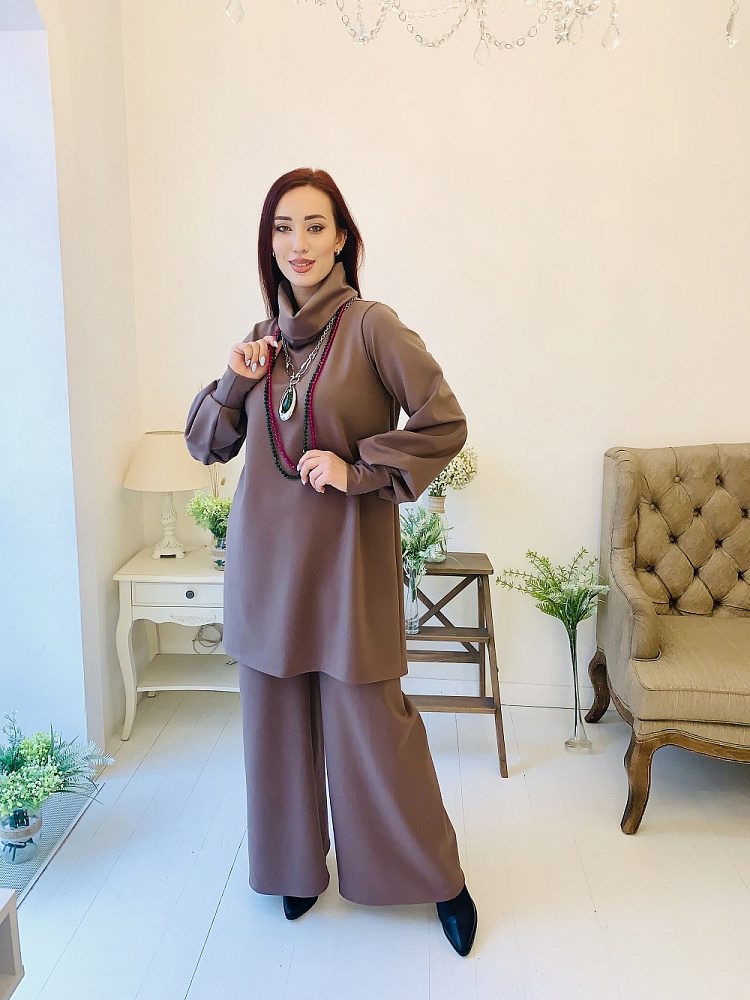 Женственный костюм - туника и широкие брюки цвета капучино. Размер 44-46-48-50. Ткань - ромэ. Аксессуары в комплект не входят. Производство Ателье Фатмафэшн.