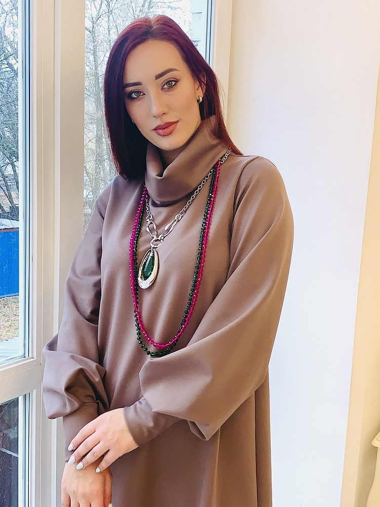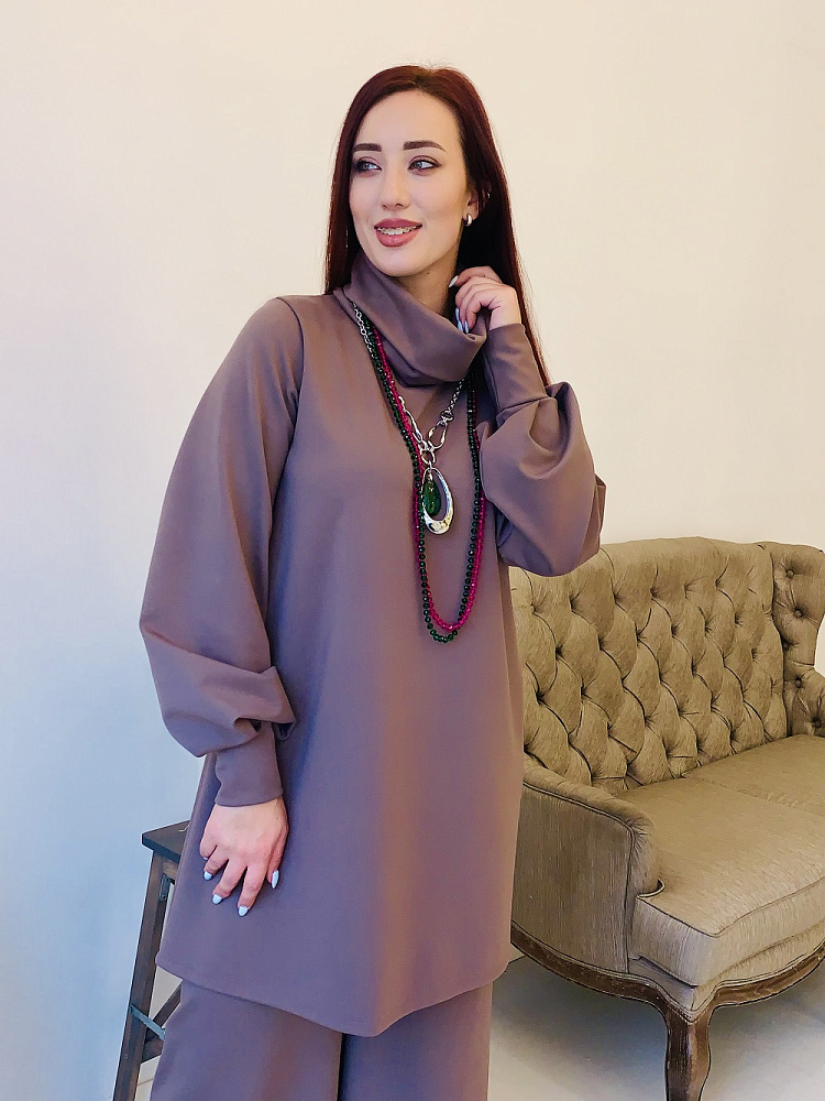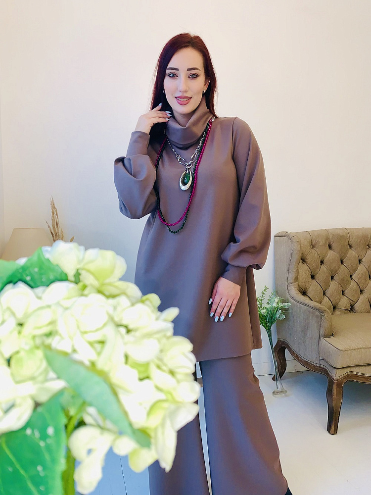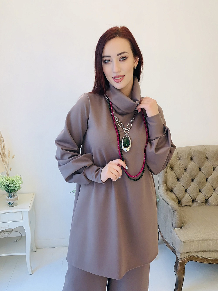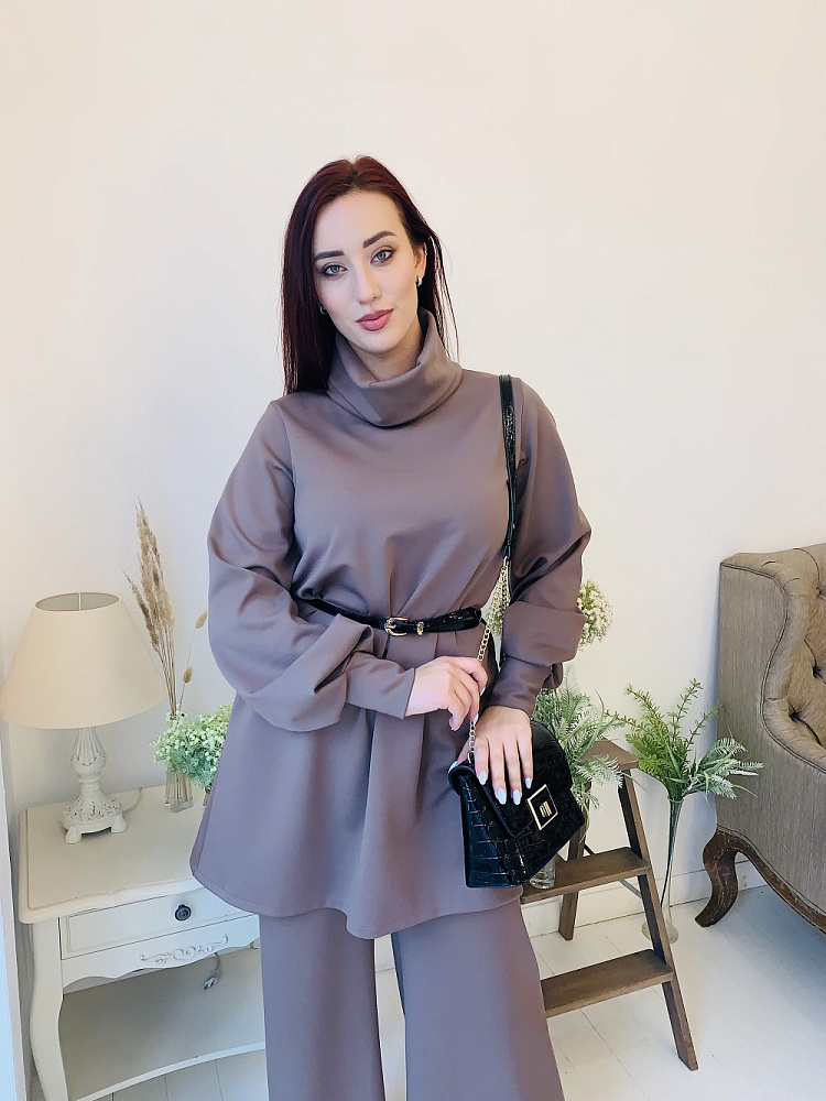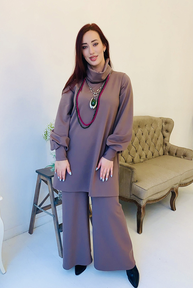 Женственный костюм - туника и широкие брюки цвета капучино. Размер 44-46-48-50. Ткань - ромэ. Аксессуары в комплект не входят. Производство Ателье Фатмафэшн.