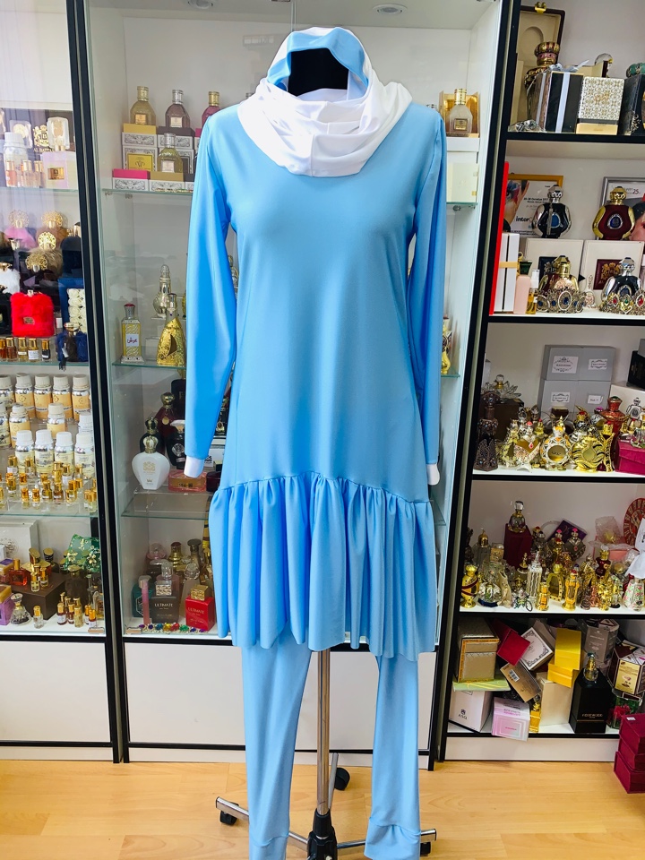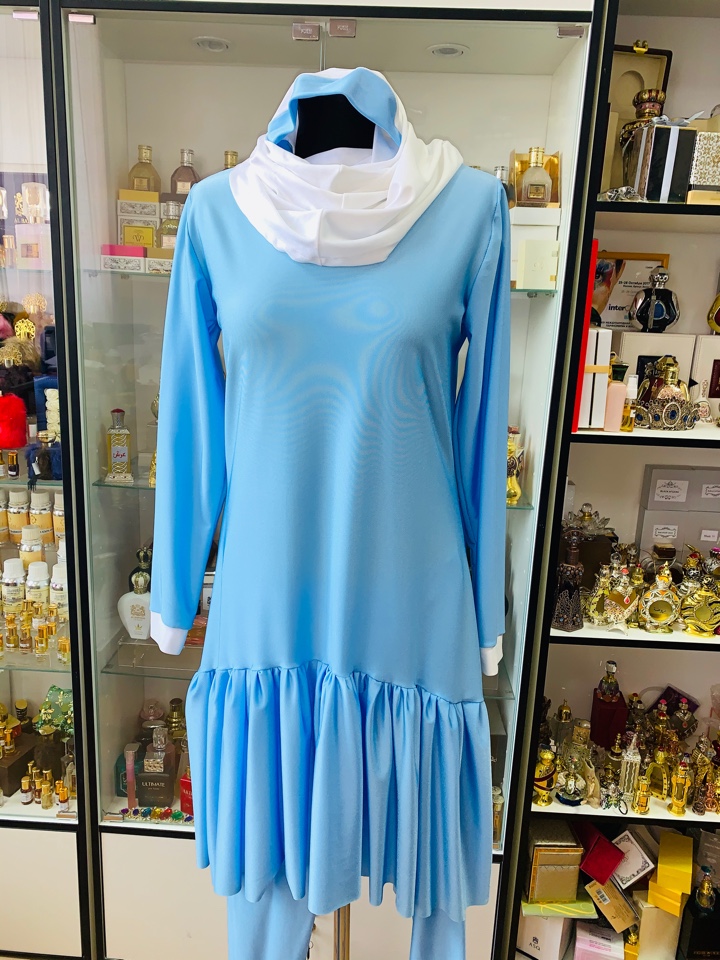 Красивый купальник буркини нежно-голубого цвета из бифлекса. В комплект входит - туника, лосины и капор. Размеры 44-46-48-50. Производство Ателье Фатмафэшн