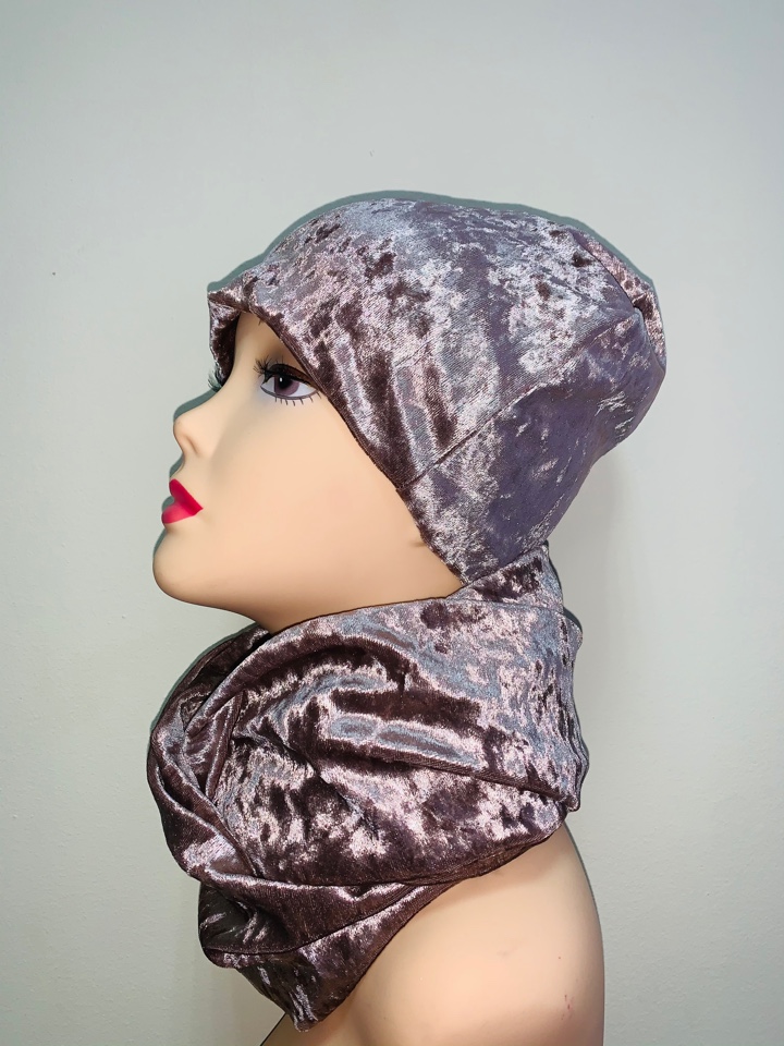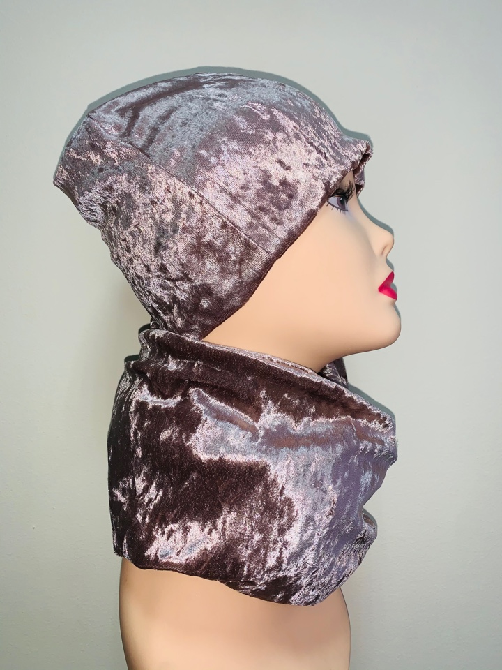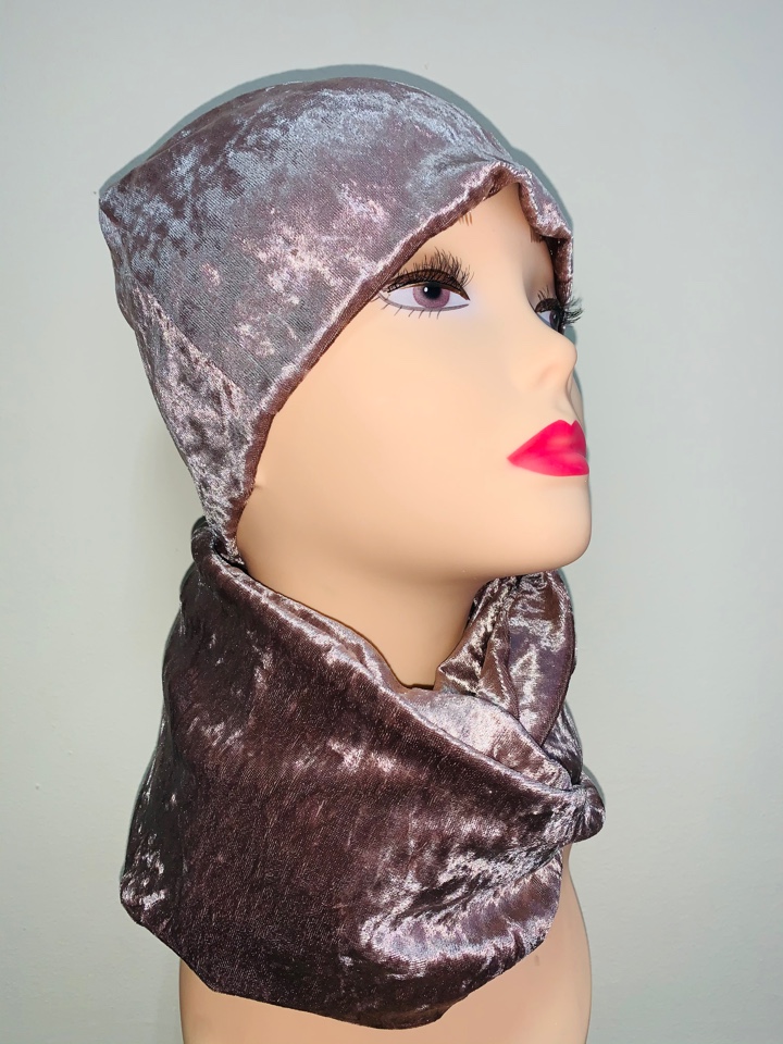Красивый комплект набора - шапка и снуд хомут из мраморного бархата нежно-бежевого цвета. Производство Ателье Фатмафэшн