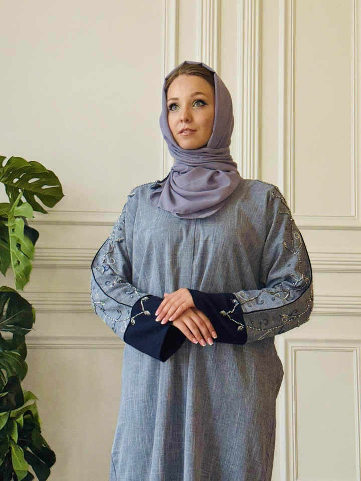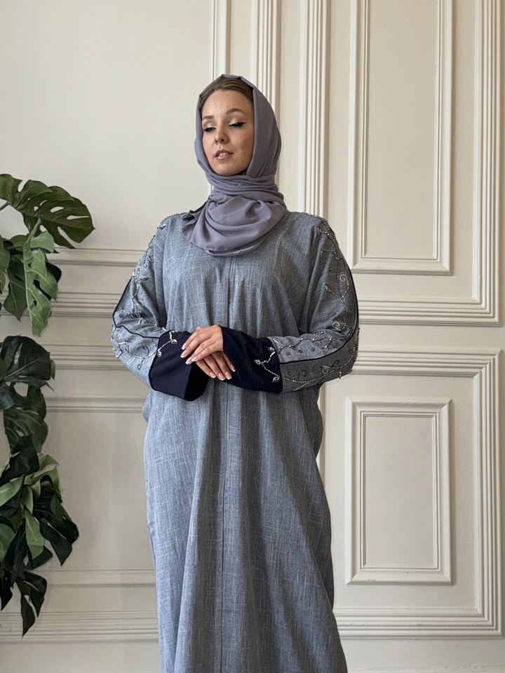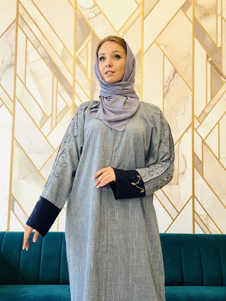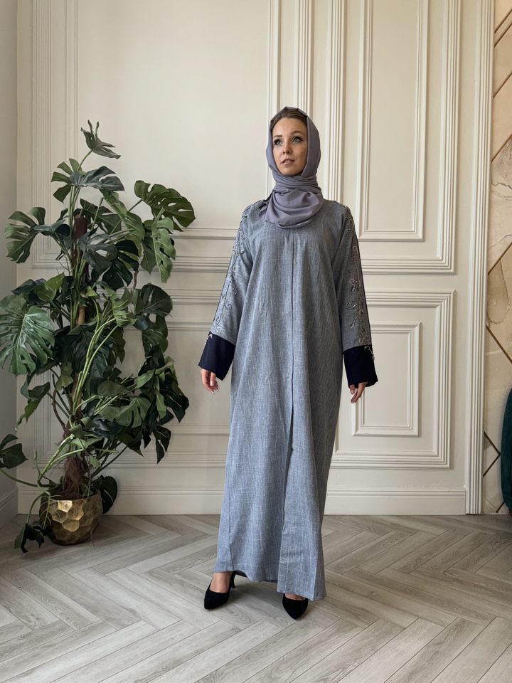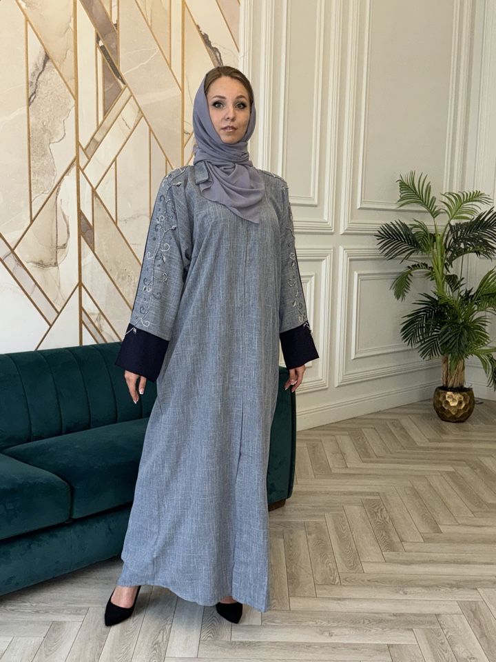 Мусульманская абая Катара из тончайшего льна. Декорирована вышивкой. Палантин в комплекте. Размерный ряд от 44-54. Тип застежки-кнопки. Производство ОАЭ.