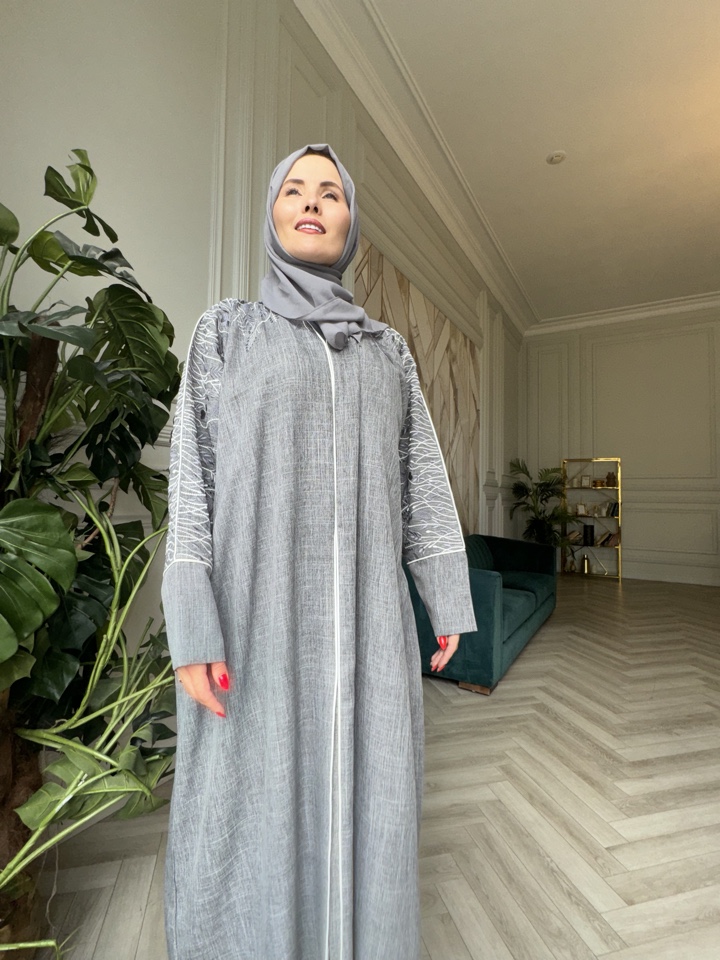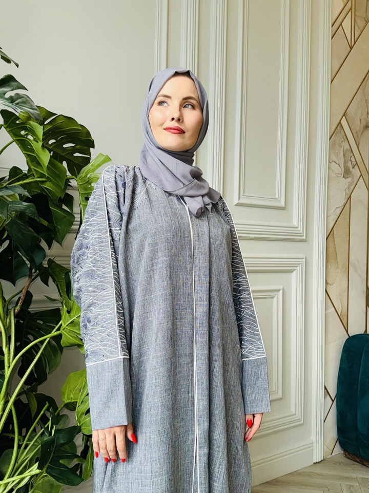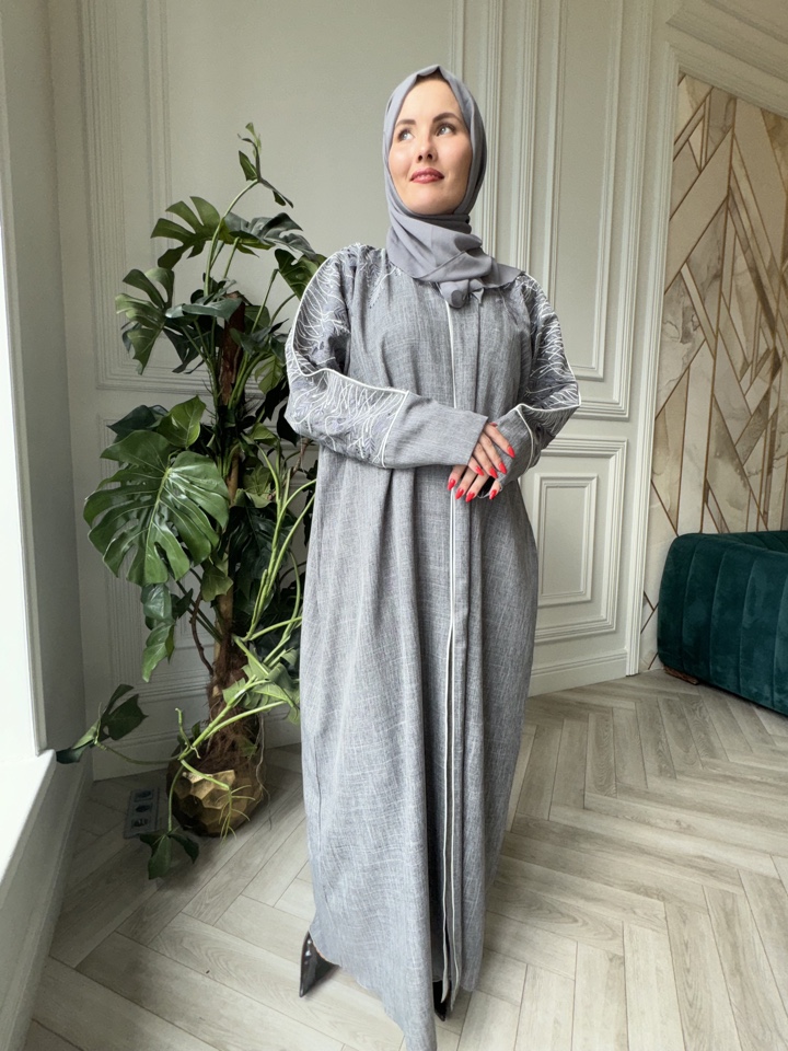Мусульманская абая Сафина из тончайшего льна. Декорирована вышивкой. Размерный ряд от 44-54. Тип застежки-кнопки. Палантин в комплекте. Производство ОАЭ.