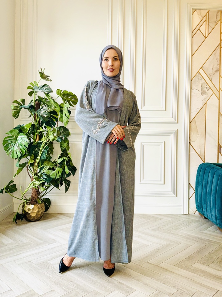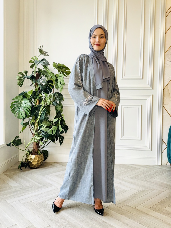 Мусульманская абая Саният из тончайшего льна. Декорирована вышивкой и стразами. Размерный ряд от 44-54. Тип застежки-кнопки. Палантин в комплекте. Производство ОАЭ.