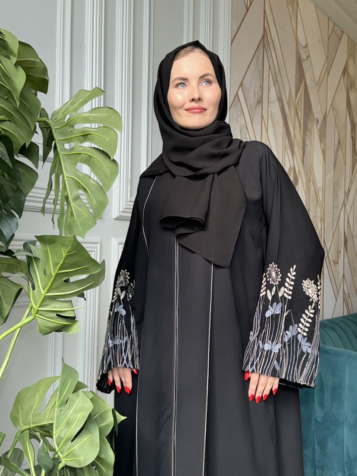 Мусульманская абая Сара-Лия из тончайшего льна. Декорирована вышивкой. Размерный ряд от 44-54. Тип застежки-кнопки. Палантин в комплекте. Производство ОАЭ.